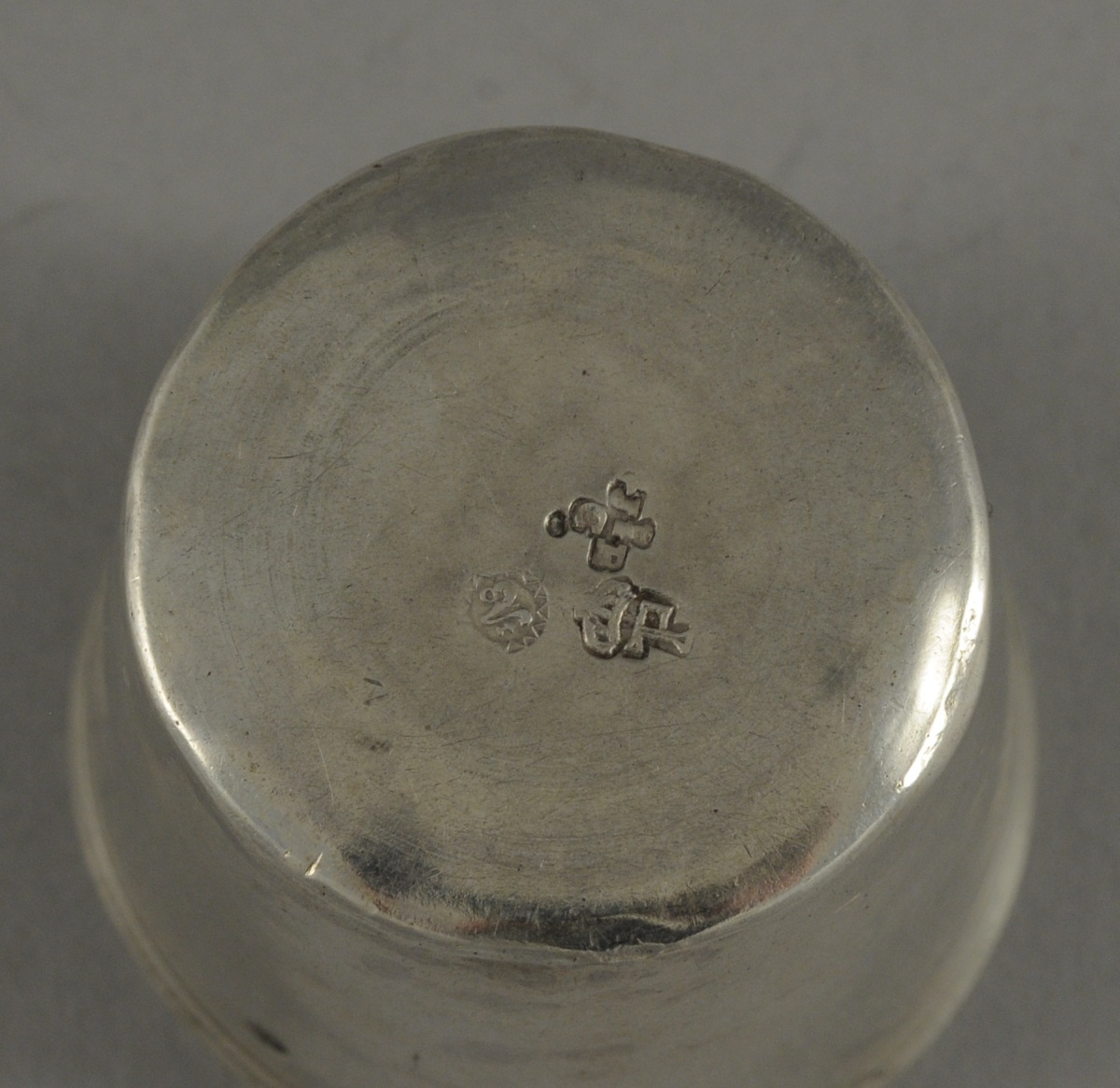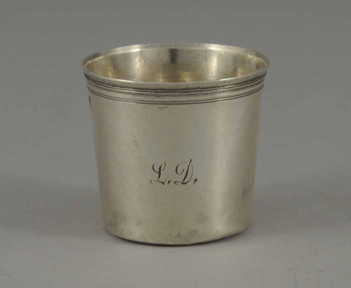 GOBELET À LIQUEUR de forme tronconique en argent uni. Le col gravé de filets. Monogramme "L.D." postérieur.