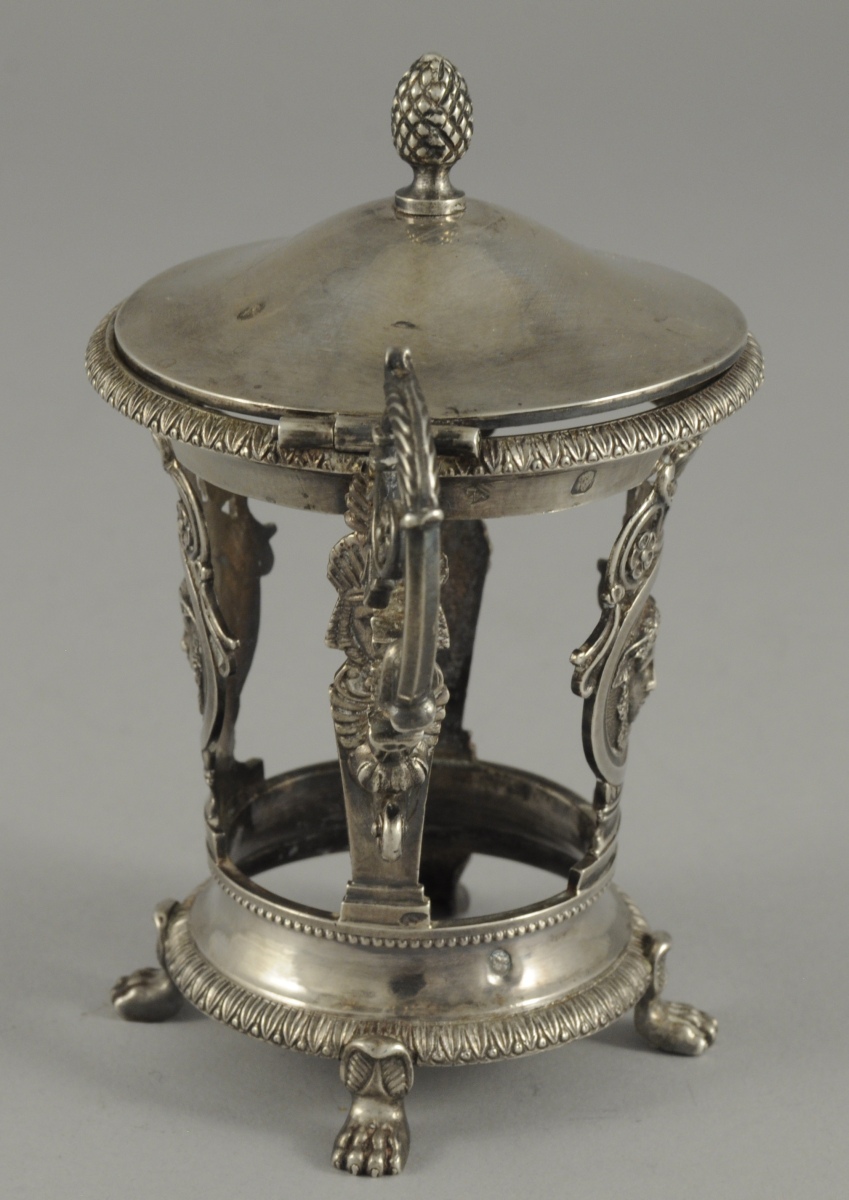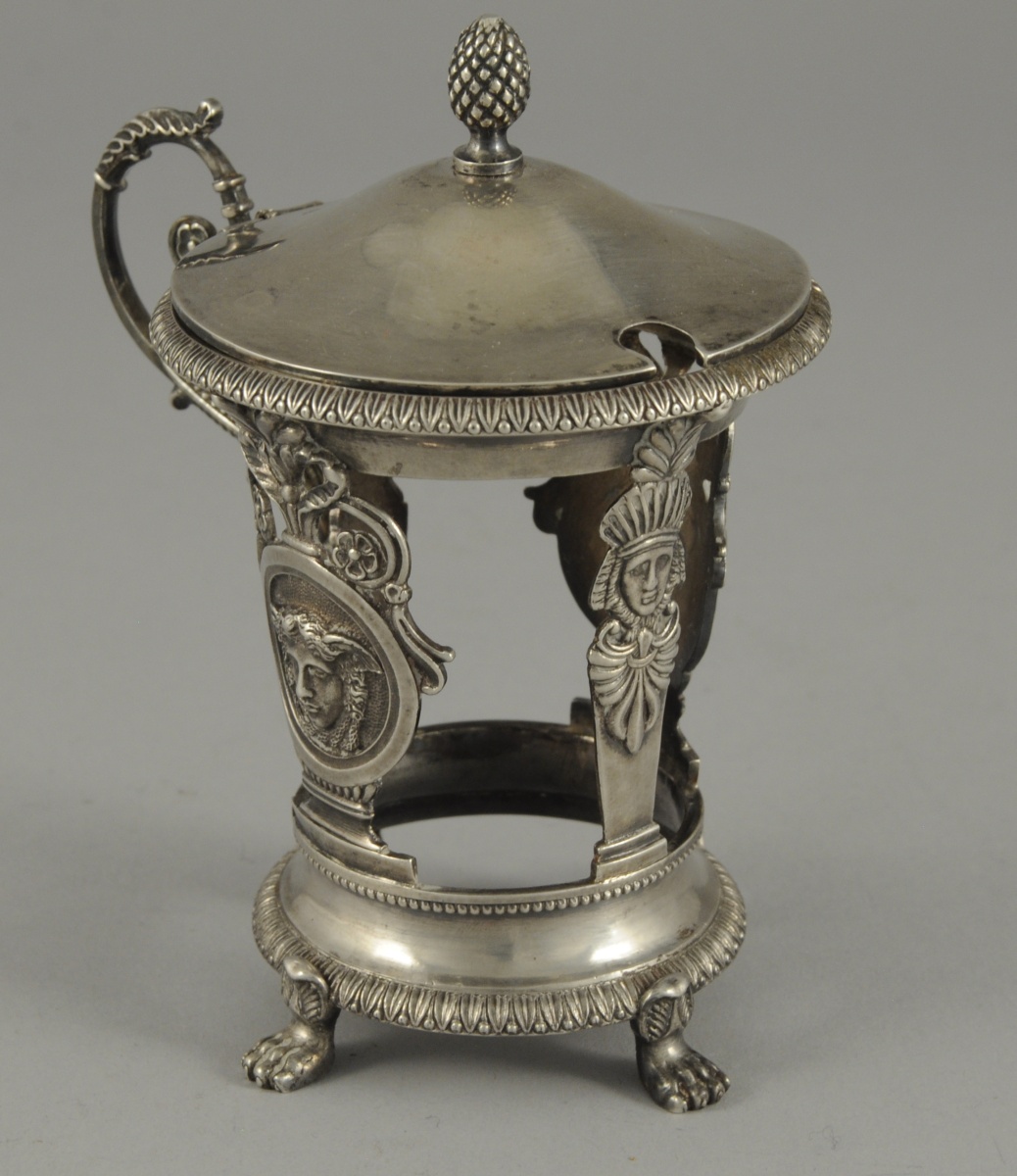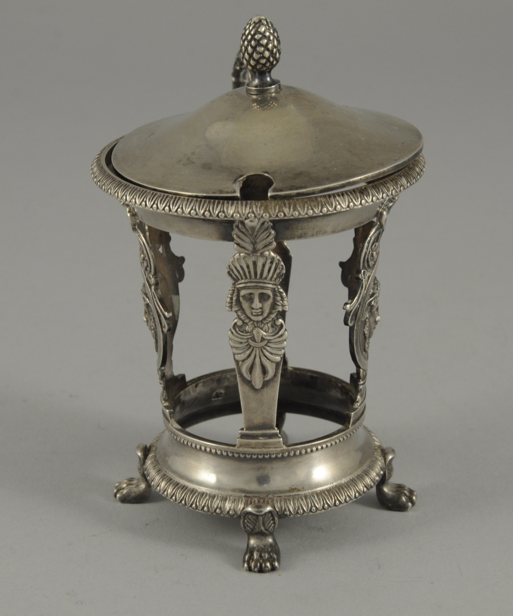MOUTARDIER de forme tronconique en argent reposant sur quatre pates de lion. Décor de tête de Mercure et de cariatides gainées couronnées de plumes. Il présente également un répertoire ornemental végétal tel que frises de feuilles d'eau, palmettes et rinceaux. Anse à enroulement feuillagé, fretel en forme de pomme de pin.