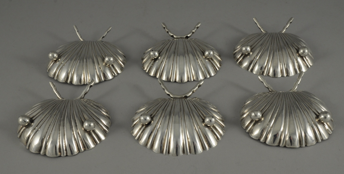 6 COQUILLES de TABLE en argent adoptant la forme d'une coquille Saint-Jacques. Ils posent sur deux pieds boule et une tige recourbée.