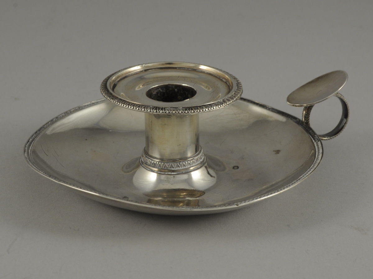 BOUGEOIR À MAIN de forme ronde en argent bordé frises de feuilles d'eau sur le binet et de palmettes sur la coupelle. L'anneau de l'appuie-pouce ciselé de feuilles de laurier.