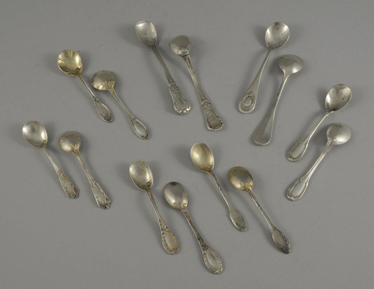 Lot de 7 PAIRES DE CUILLÈRES À SEL en argent, dont certaines avec le cuilleron en vermeil, une paire monogrammée, une paire à décor de chardons...