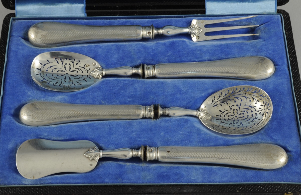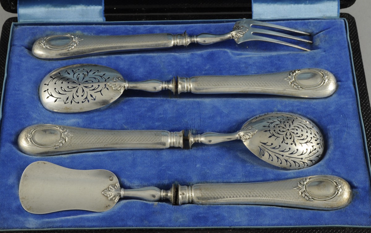 Suite de 4 PIÈCES DE SERVICE à HORS D'OEUVRE en argent. Les manches en argent fourré à décor d'un cartouche ovale feuillagé sur fond guilloché. Elle comprend une cuillère à olives et une pelle à thon repercées; une pelle à beurre et une fourchette.
