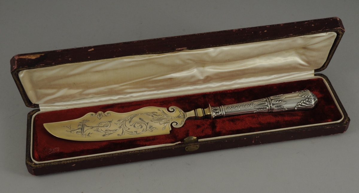 COUTEAU À GATEAU en argent. Le manche en argent fourré à déco de frises de feuilles lancéolées, branche de laurier, palmettes et feuilles d'acanthe stylisées.