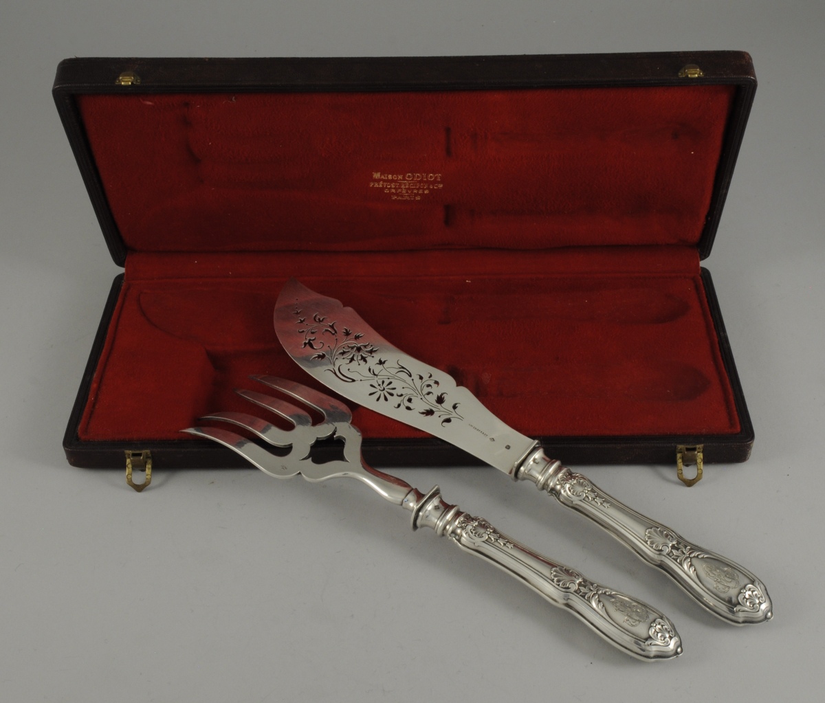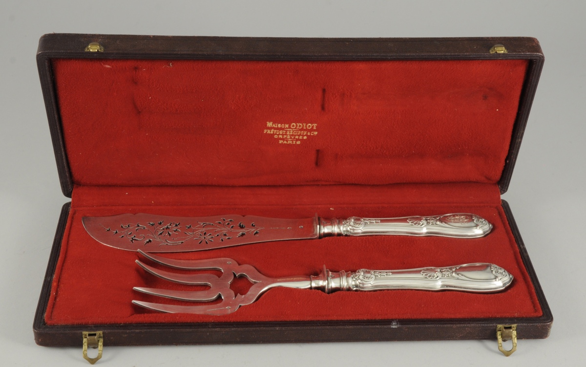 ODIOT PRÉVOST. FOURCHETTE ET COUTEAU DE SERVICE À POISSON en argent. Le manche en argent fourré à décor de feuilles d'acanthe stylisées, coquilles et agrafes. La lame du couteau ajourée de hampes florales stylisées. Monogramme "CA".