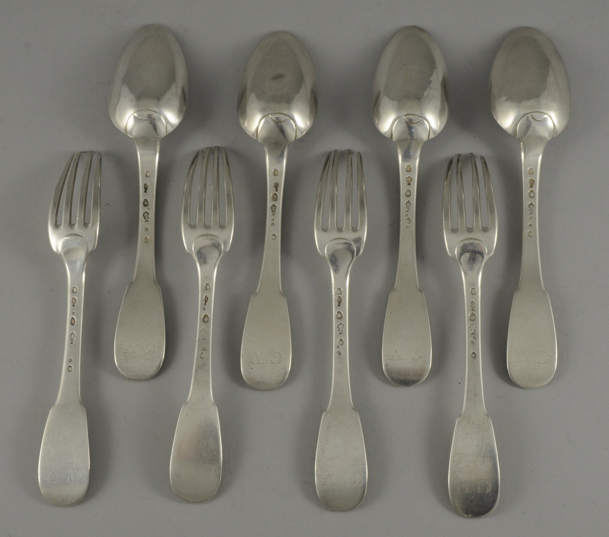 - COUVERT et FOURCHETTE DE TABLE. Modèle uniplat. Maître-Orfèvre: Jean-François Oury, orfèvre-cuilleriste au 7, passage de la Réunion à Paris. Poinçon Vieillard, 1819-1838. Monogrammés "CV". Poids: 135 g.