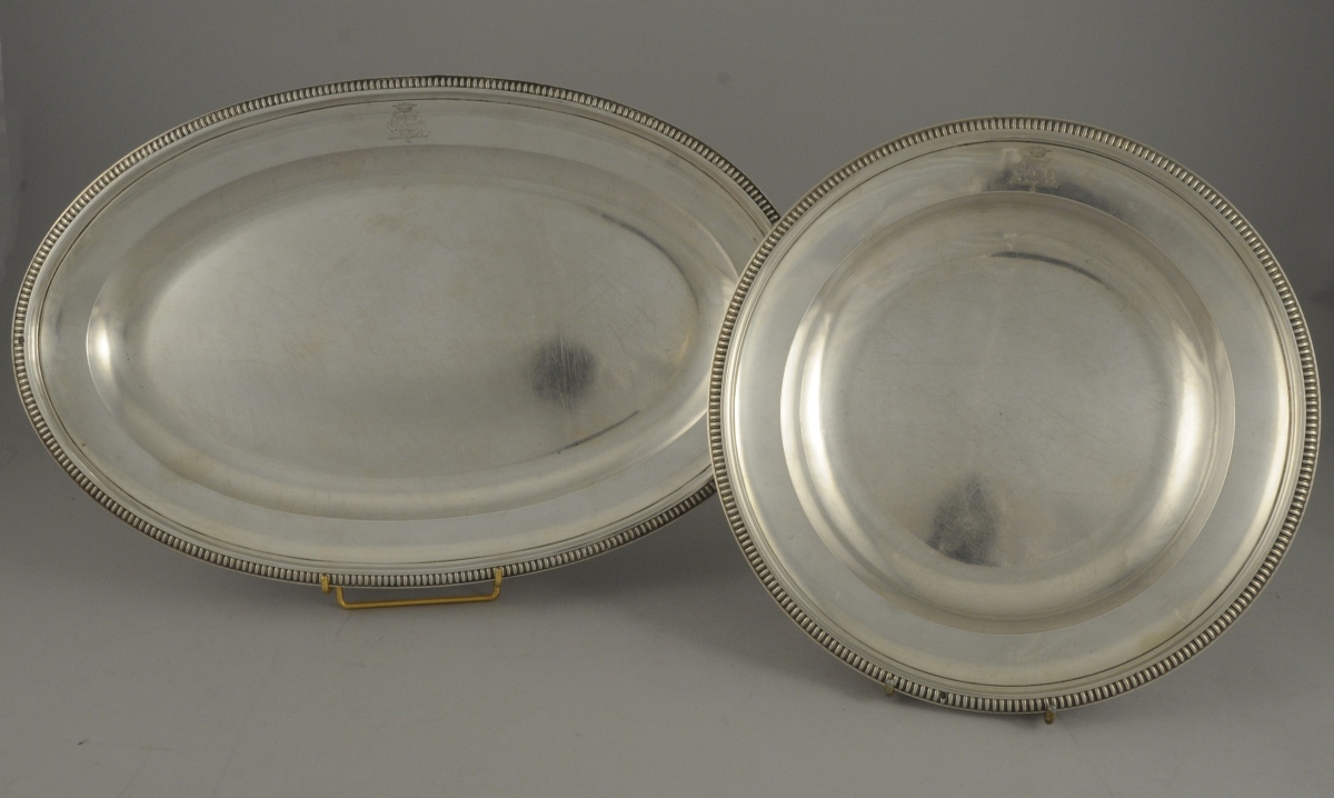 2 PLATS, ovale et rond, en ARGENT, modèle à contours godronnés. Armories sommées d'une couronne de marquis et décorées de l'ordre de Saint-Louis.