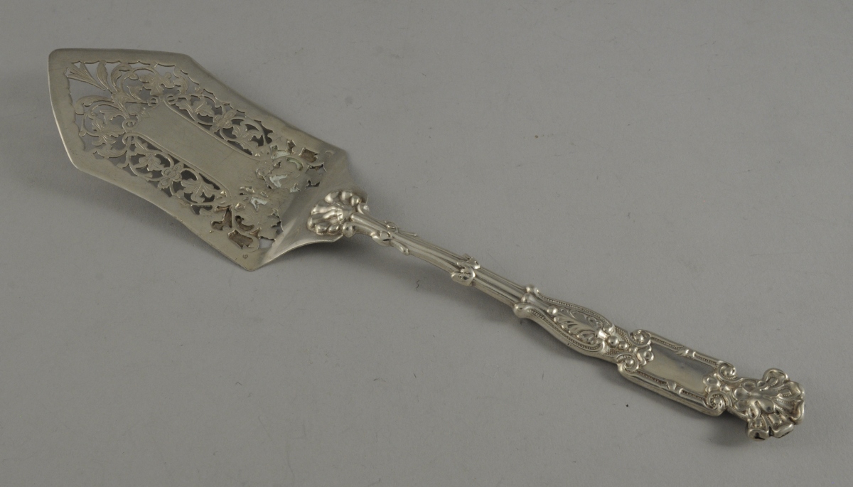 PELLE à GATEAU en argent fourré. Manche en argent fourré à décor d'une coquille, de feuilles d'acanthe et de rinceaux. La pelle en métal argenté ajourée de rinceaux feuillagés.