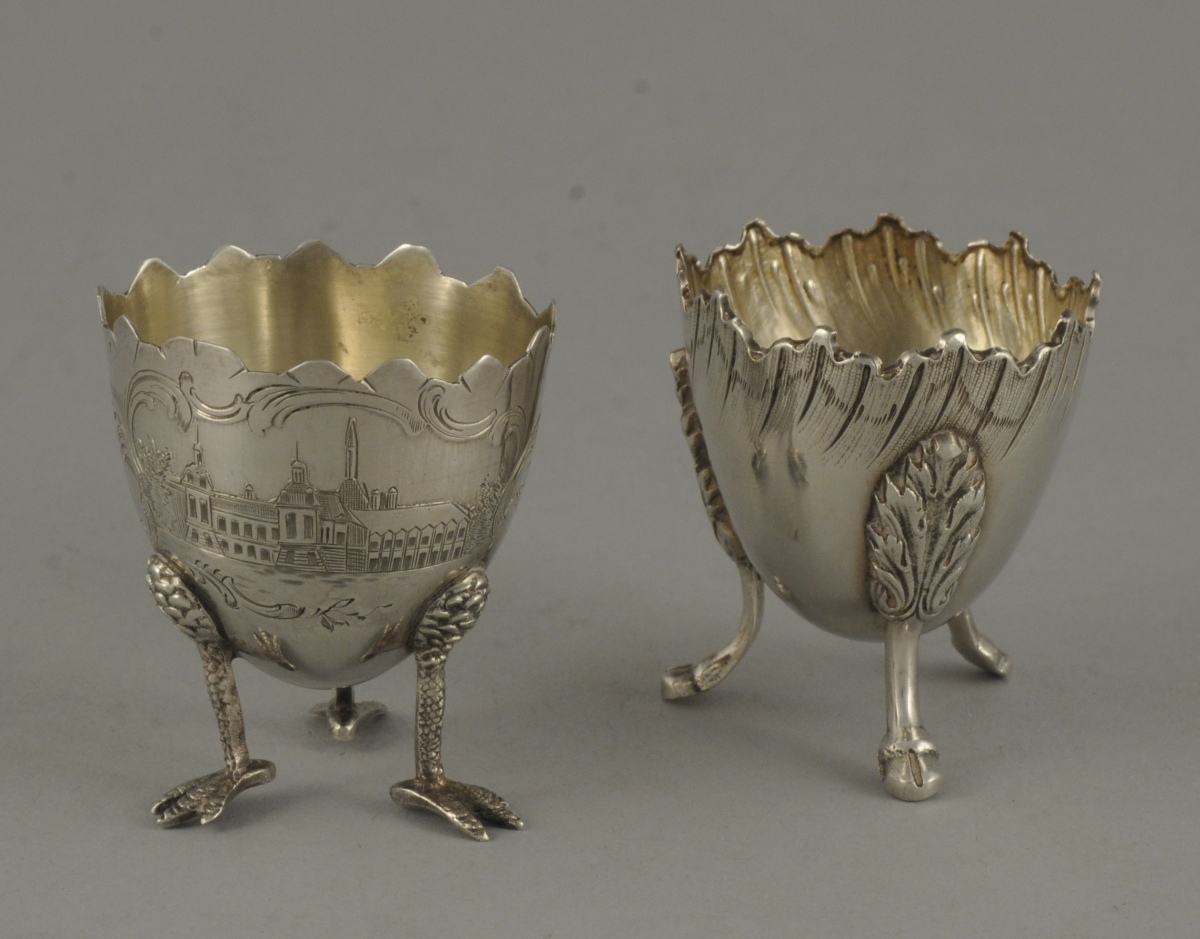 -Le premier figurant une coquille brisée ornée d'une vue du château de Chantilly et gravée "Chantilly". Il pose sur trois pieds figurant des pattes de poules.