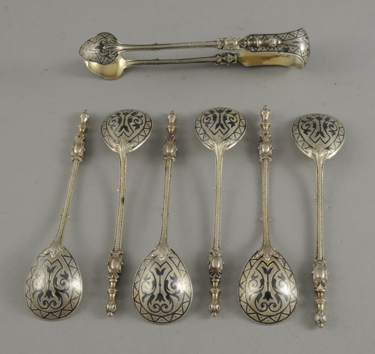 Suite de 6 CUILLÈRES À CAFÉ et une PINCE À SUCRE en argent niellé. Décor de feuillages stylisés et dents de loup.
