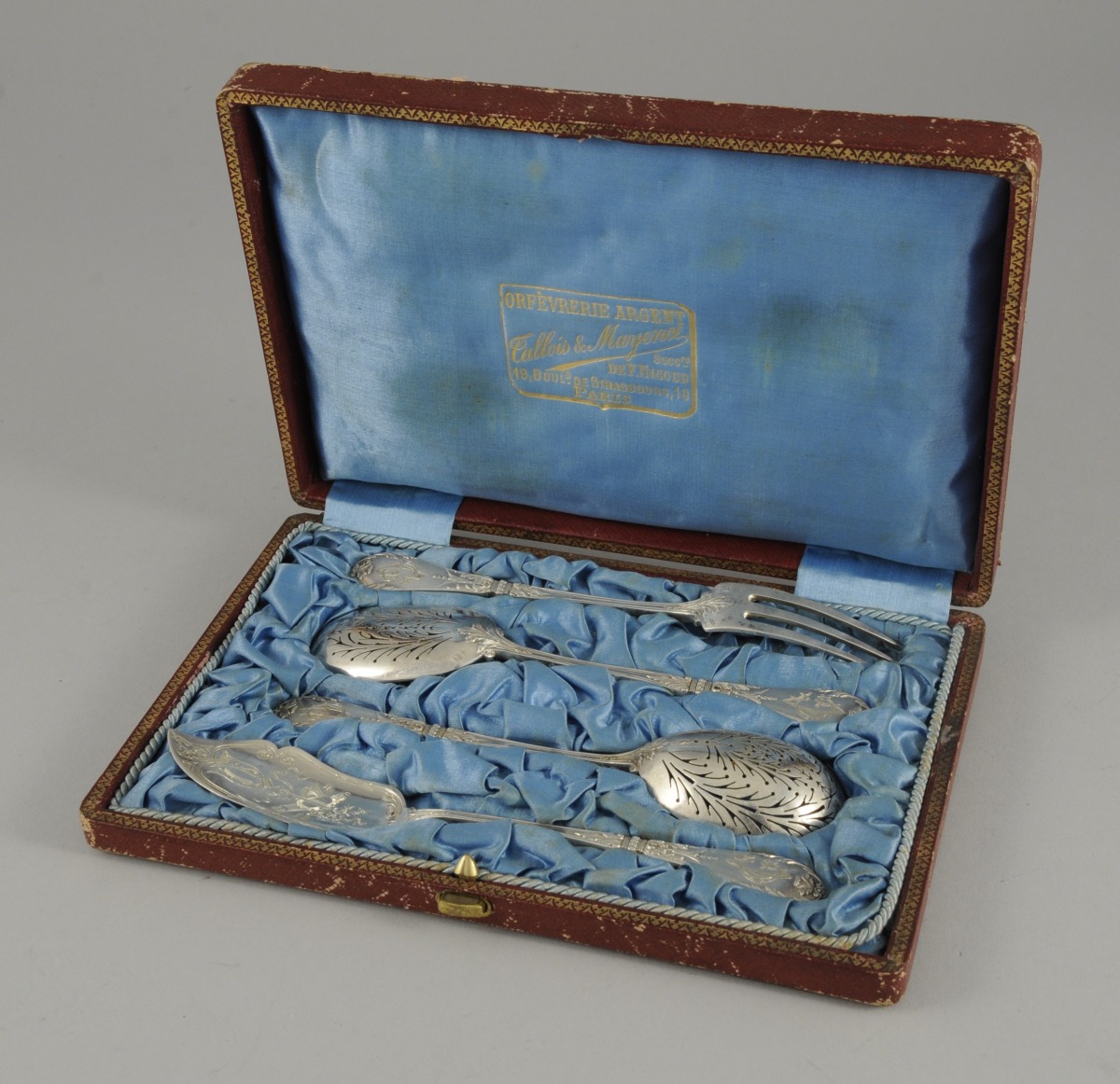 Suite de 4 PIÈCES DE SERVICE À HORS-D'OEUVRE. Décor de feuilles d'acanthe stylisées et d'une petite frise d'oves. Elle comprend une pelle à thon; une cuillère à olives, une fourchette et un petit couteau, la lame gravée d'un trophée figurant carquois, flèches et branchages. Monogramme "GG".