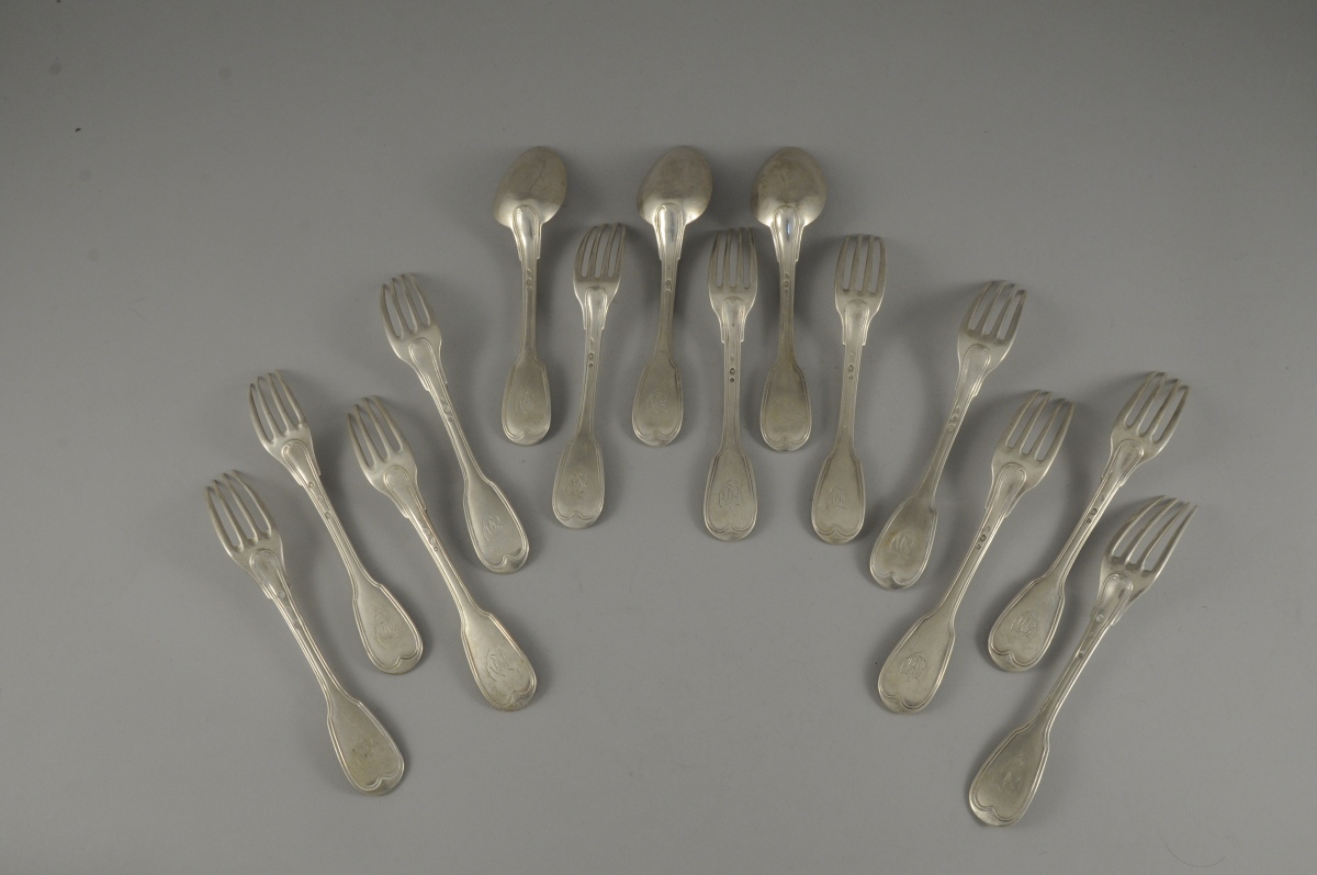 -Suite de 3 COUVERTS et 5 FOURCHETTES. Modèle à filet contour. Monogramme "RD" dans un écu bordé de perles.