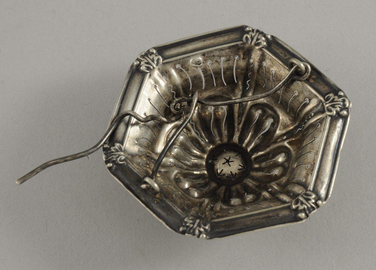 PASSE-THÉ de forme hexagonale en argent. Décor au repoussé de feuilles d'acanthe stylisées.