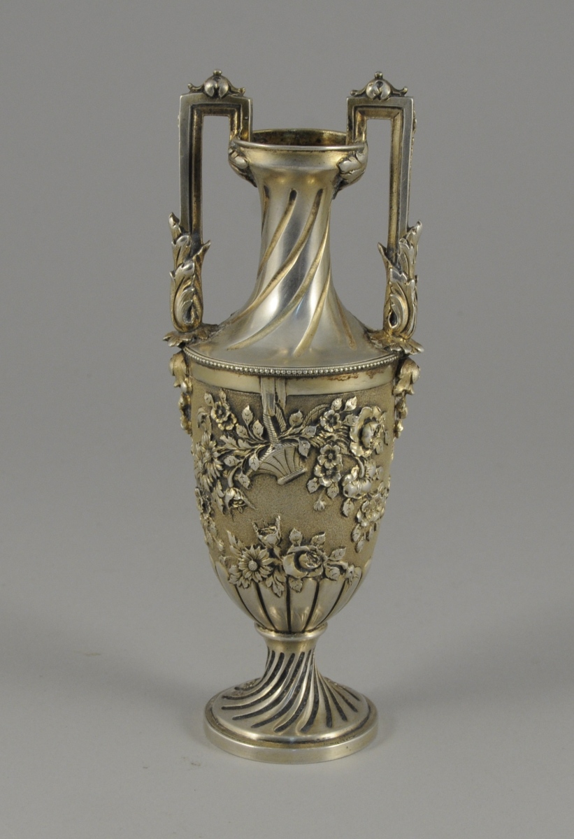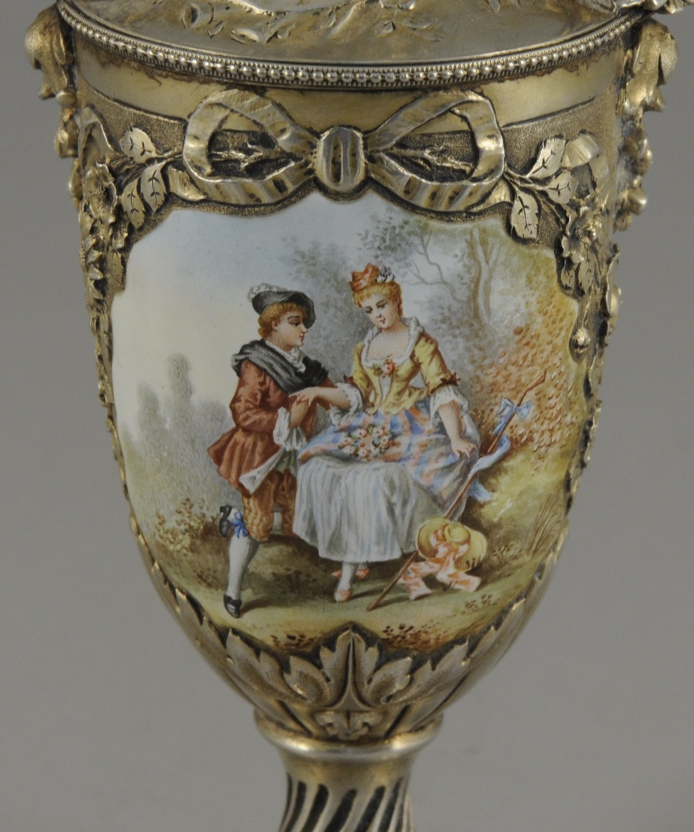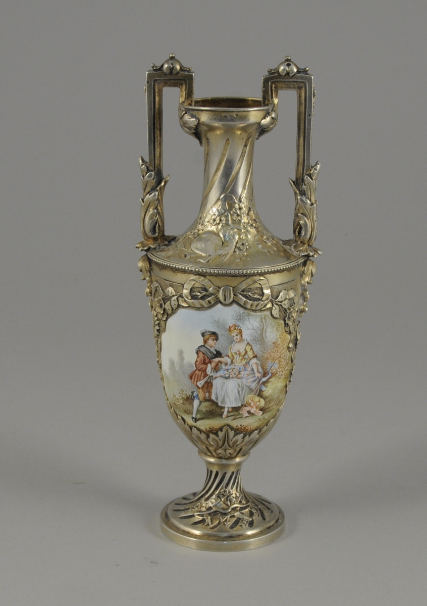 VASE BALUSTRE en argent à décor ciselé de rubans, gerbes de fleurs et attributs musicaux. Décor émaillé d'une scène romantique sur la panse.