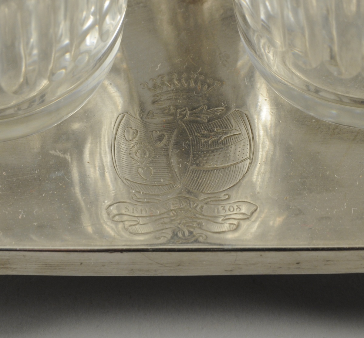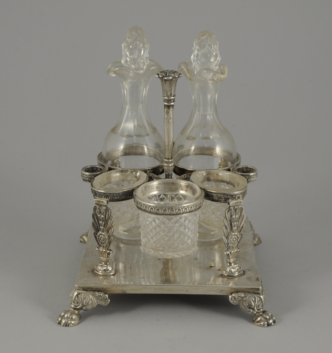 SERVICE À INGRÉDIENTS de forme carrée en argent. Il pose sur quatre pieds en patte de lion à attache feuillagée. Les porte-contenants ciselés d'une frise de feuilles d'eau retenus aux extrémités par des palmettes et au centre par une colonne à enroulements feuillagés. Gravé d'armes d'alliance timbrées d'une couronne comtale et soulignées d'un listel portant l'inscription "SENS TEQVE 1308". Les bouteilles et réceptacles en verre taillé comprenant un huilier-vinaigrier, deux salières et un godet à moutarde.