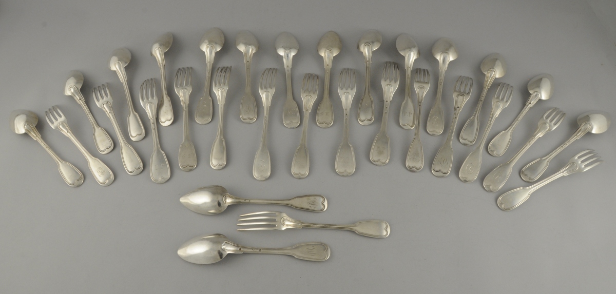-SUITE comprenant un couvert et deux cuillères, monogramme "LT"; un couvert monogrammé "AV" (orfèvre différent); un couvert monogrammé "SL"; une paire de fourchettes; une paire de cuillères; 3 fourchettes et 3 cuillères. Poinçon Minerve. XIXème.