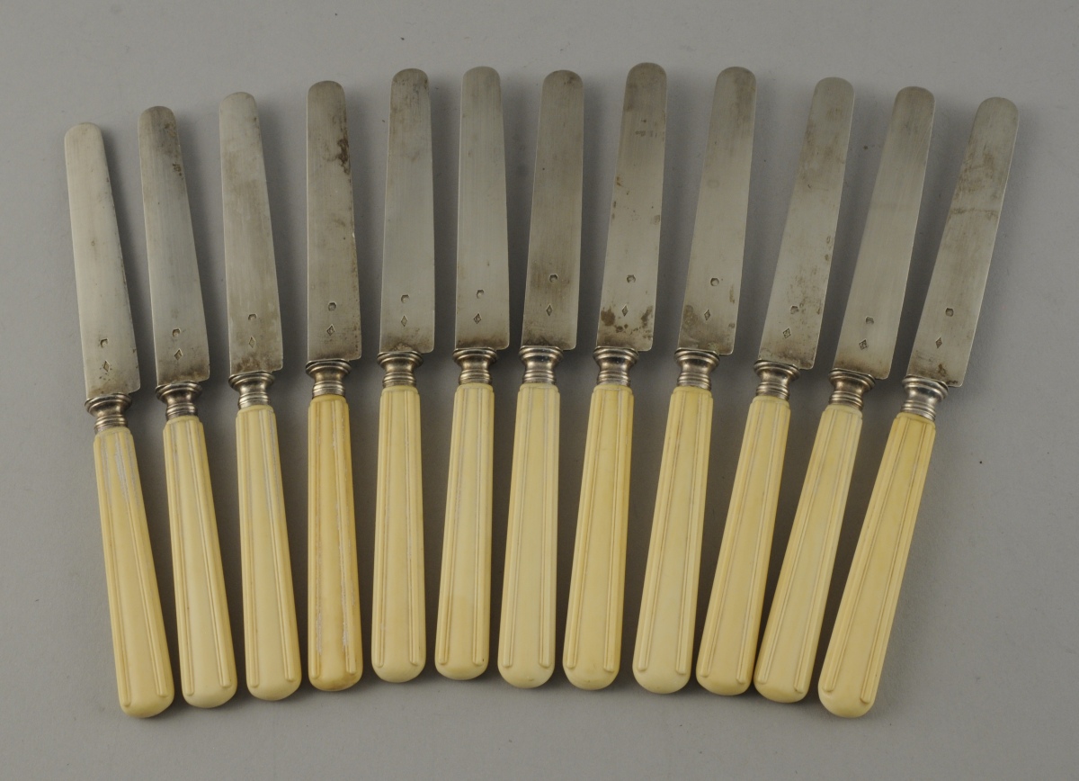 Suite de 12 COUTEAUX À FRUITS. La lame en argent et le manche en ivoire sculpté.
