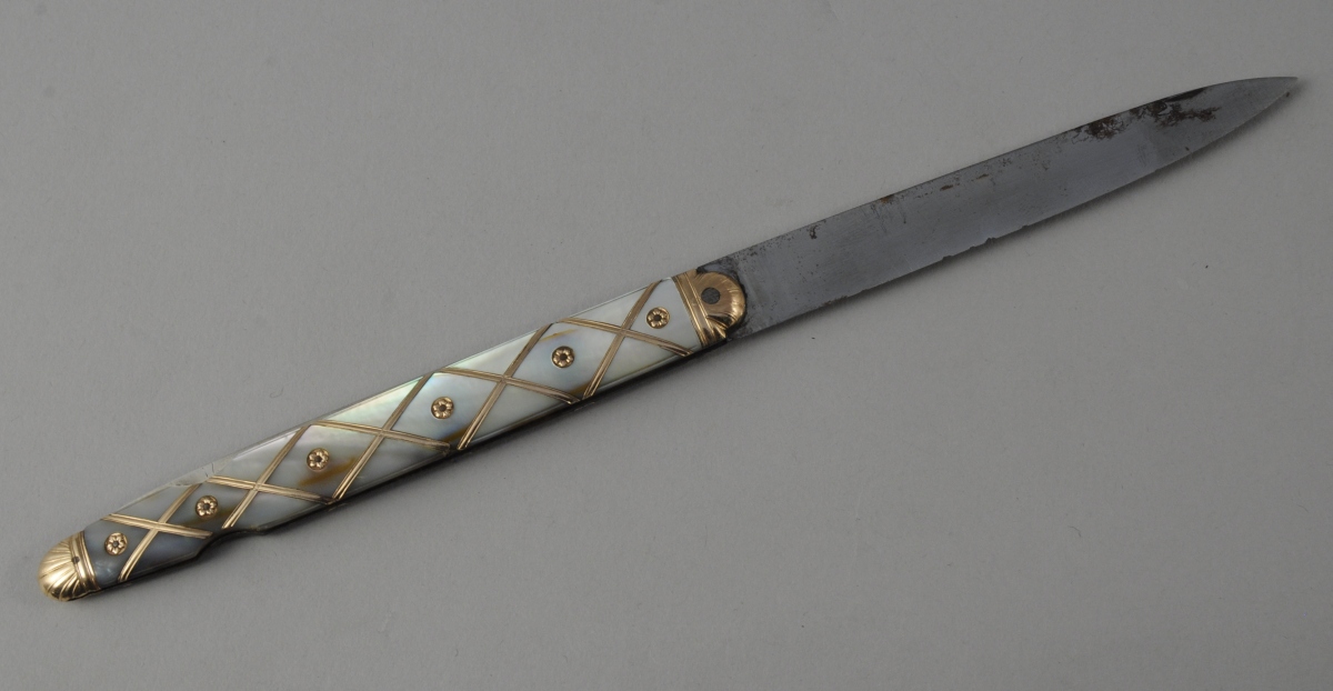 COUTEAU DE VOYAGE dit "à tête de compas" à lame double en acier et argent. Manche à plaquettes de nacre incrustées de filets d'or formant quadrillage et de fleurettes d'or sur les cloutages. Mitres en forme de coquille en or.