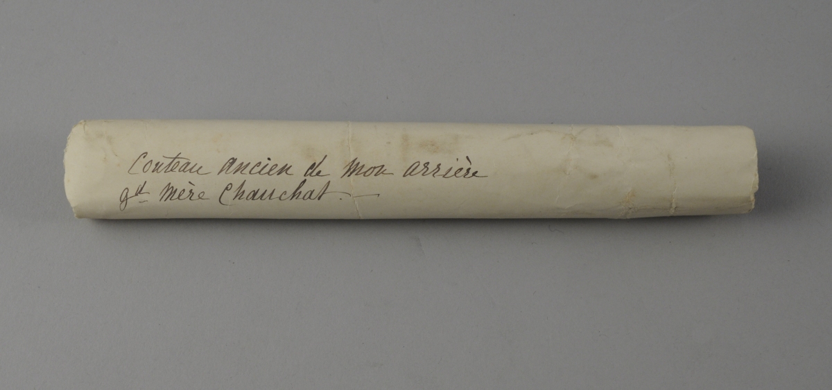 Dans son étui en galuchat brun (accidents). Accompagné d'un papier portant une ancienne mention manuscrite à l'encre: "Couteau ancien de mon arrière gd mère Chauchat"