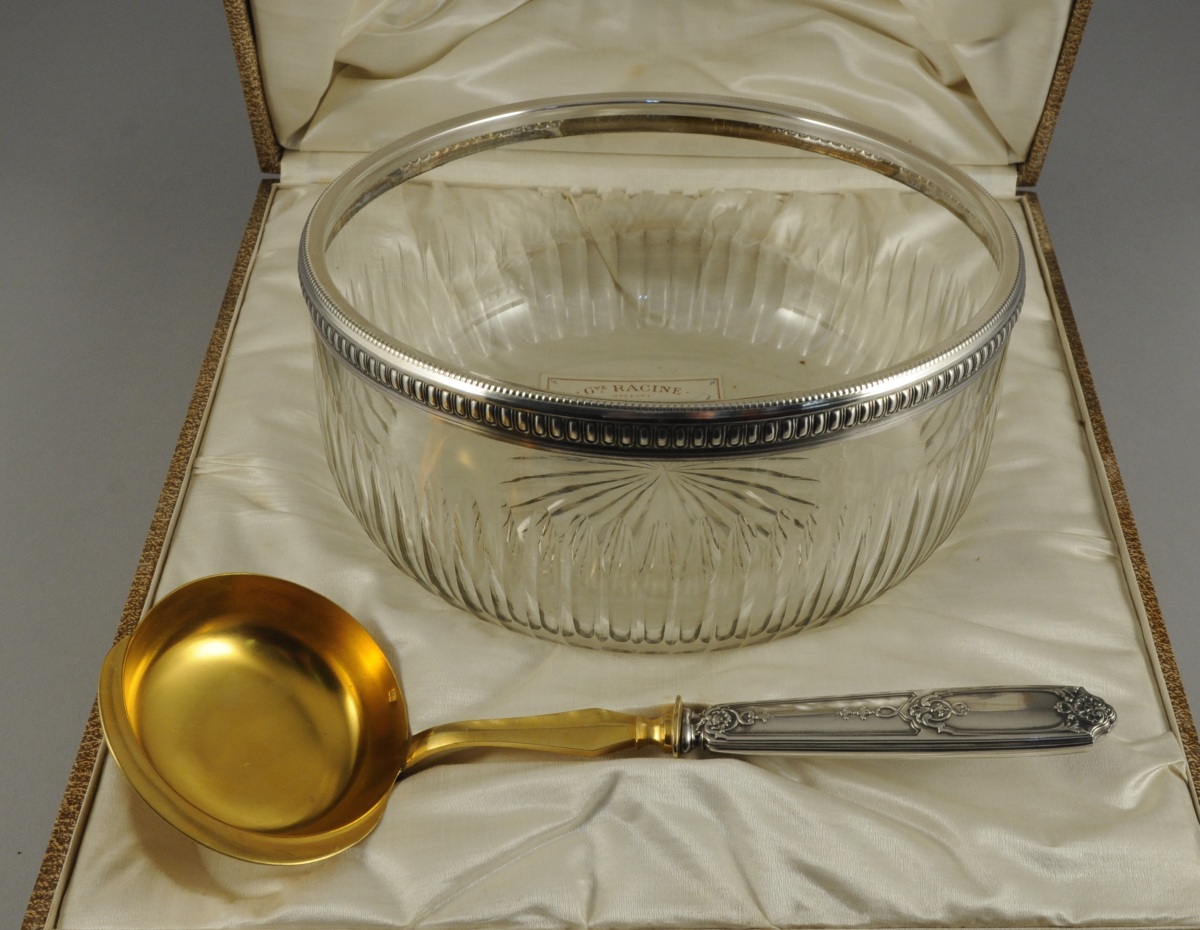 BOL À PUNCH et LOUCHE À PUNCH. Le bol en demi-cristal taillé de larges cannelures et d'une rosace. Le col cerclé d'argent à décor de godrons et rais de perles. Le manche de la louche en argent fourré à décor de coquilles, fleurons et ferronneries. Le cuilleron en métal doré.