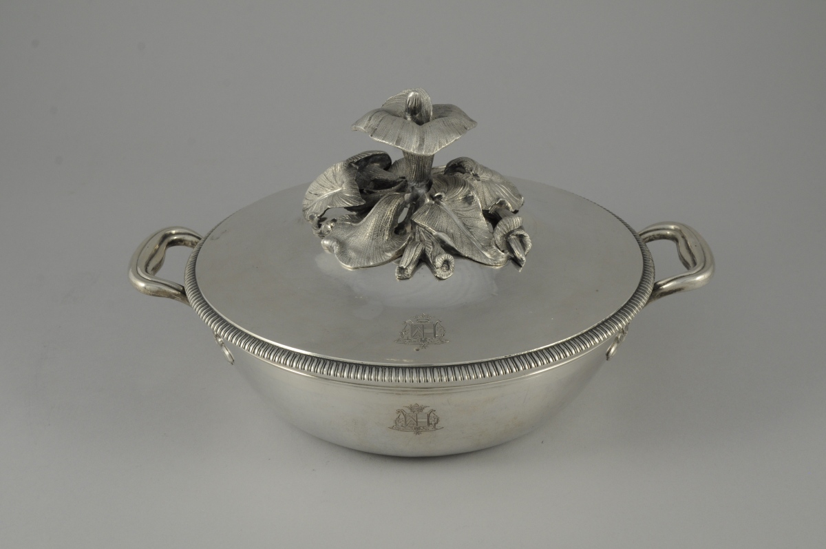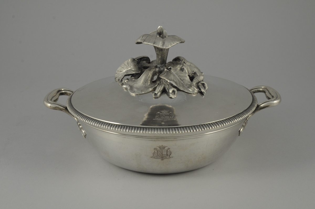 Grand LÉGUMIER COUVERT en argent, modèle à contours godronnés. Les poignées ornées de feuilles d'acanthe stylisées. Armories sommées d'une couronne de marquis et décorées de l'ordre de Saint-Louis. Le fretel à motif d'arômes.