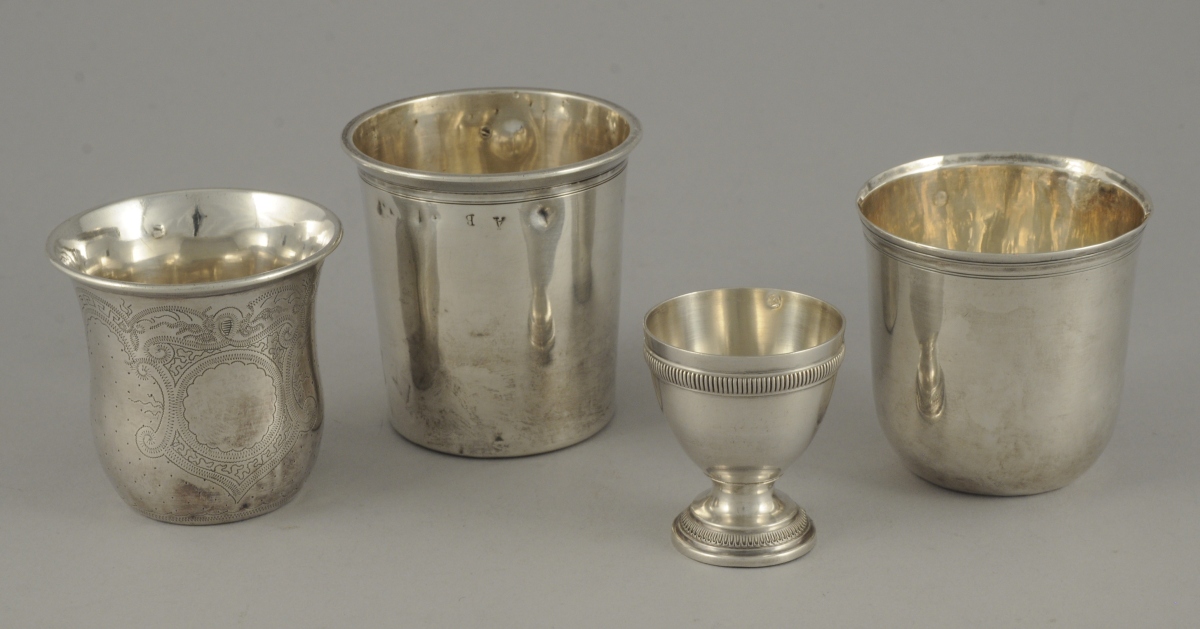 - TIMBALE à COL évasé en argent uni. Le col souligné de filets. Le fond marqué "M. PRUDHOM". Poids: 46,7 g. Poinçon 1er Coq. Paris, 1798-1809. Maître-Orfèvre: Louis-Jacques Berger, orfèvre en gobelets à Paris actif dès 1794. Haut. 6,5, Diam. 6,5 cm.