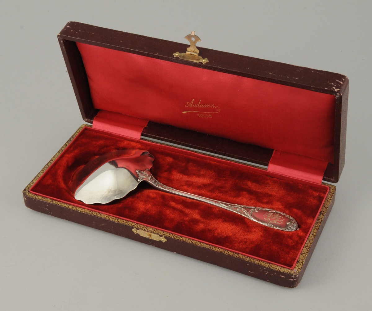 CUILLÈRE À FRAISES en argent. Décor de feuilles d'acanthes stylisées. Le cuilleron à bords chantournés gravé d'un oiseau volant près d'un bouquet fleuri et feuillagé. Monogramme "GB".