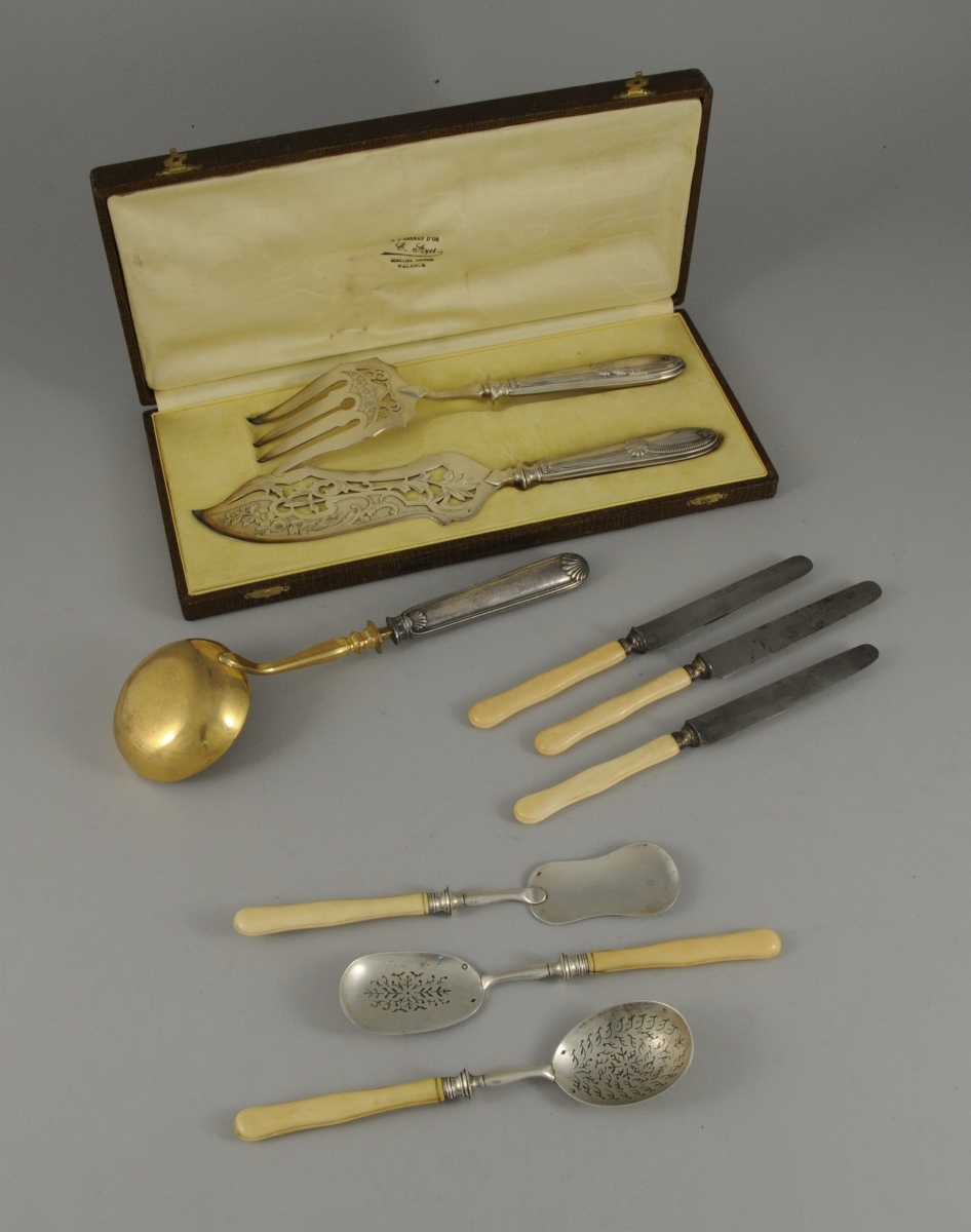 Partie de SERVICE À HORS-D'OEUVRE en argent comprenant une pelle à beurre, une cuillère à olives et une pelle à thon à décor repercé. Les manches en ivoire (fentes). Poinçon Minerve. Fin XIXème, début XXème. Poids brut: 195 g.