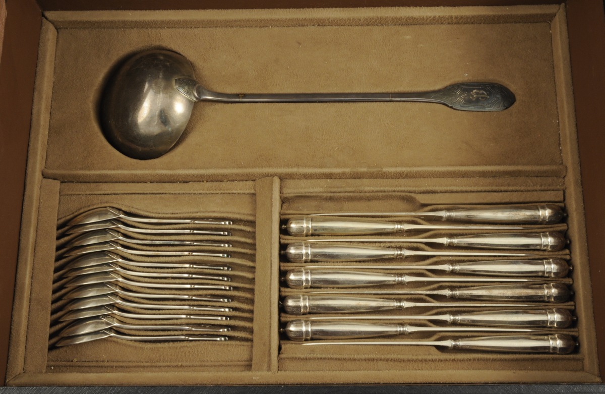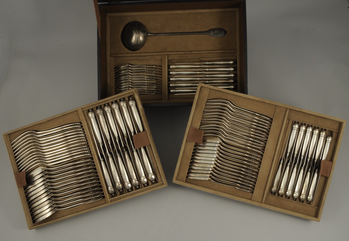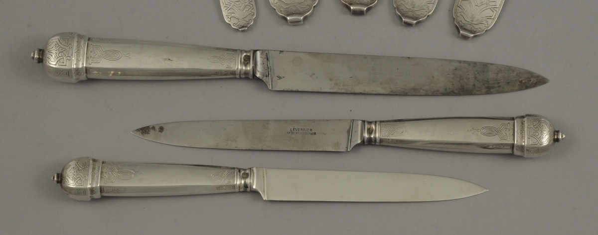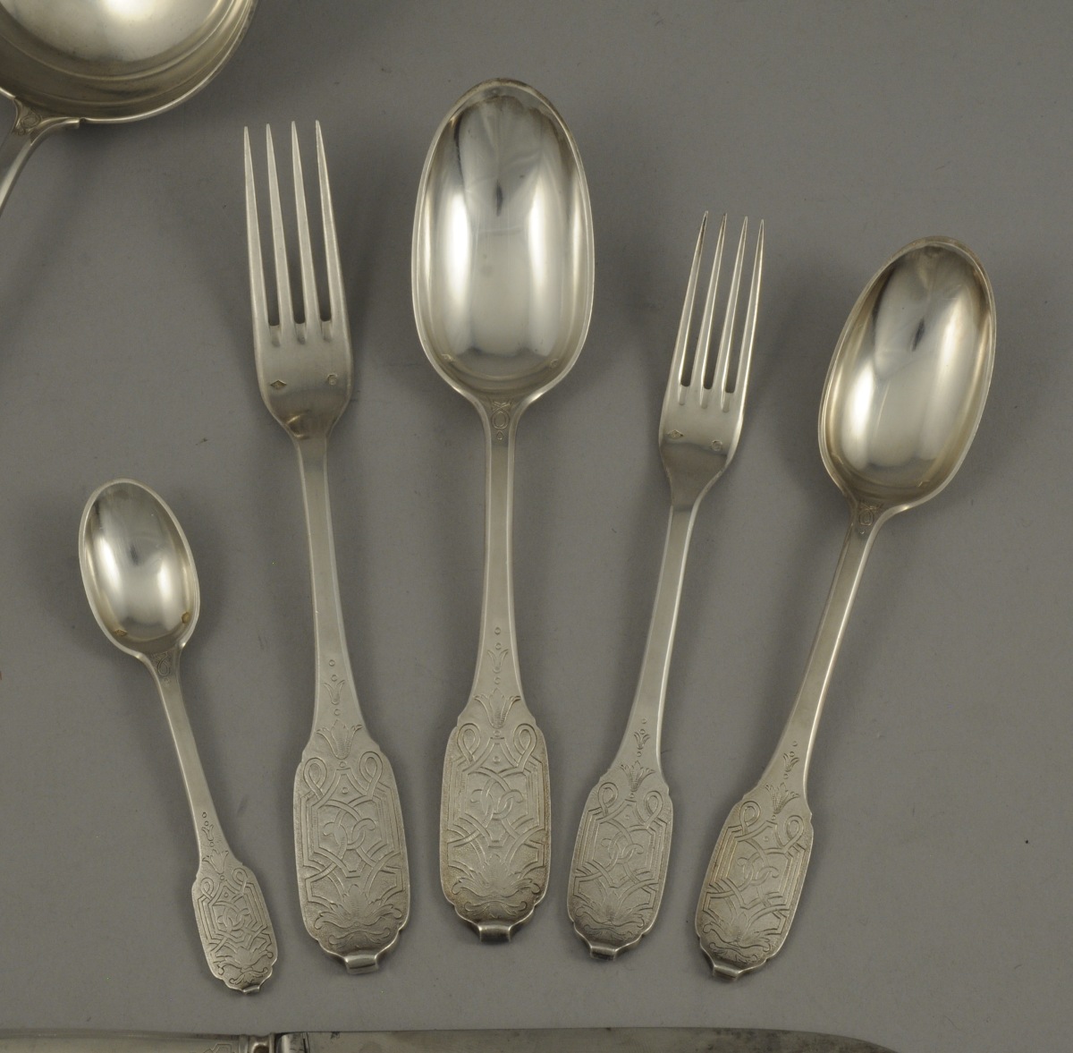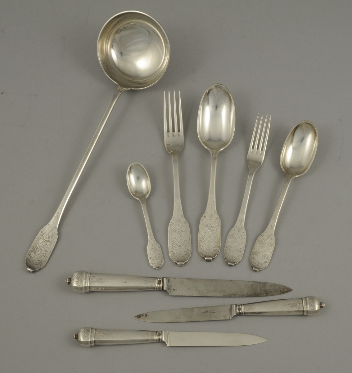 MÉNAGÈRE de 96 pièces en argent à motifs d'ARABESQUES. Elle comprend 12 couverts de table; 12 couteaux de table; 12 couverts à entremets; 12 couteaux à entremets; 11 couteaux à fruits, 12 cuillères à café et une louche.