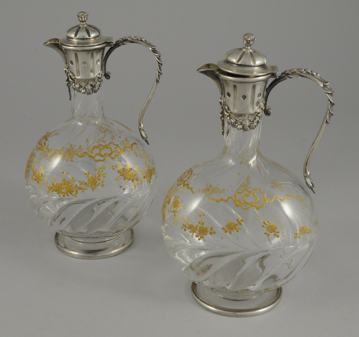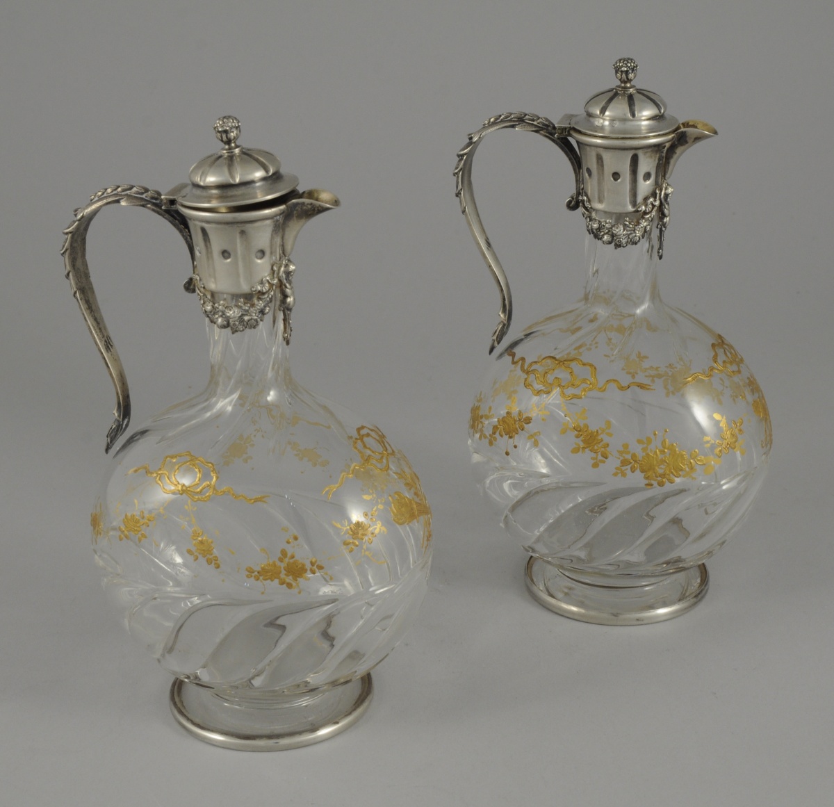 PAIRE DE CARAFONS à panse aplatie en cristal orné de godrons et cannelures rayonnants. Décor à l'or de de guirlandes de fleurs retenues par des rubans noués. Les montures en argent présentant un répertoire ornemental de style néoclassique tel que atlante gainé, guirlandes de fleurs, cannelures et piastres. Prise en forme de graine.