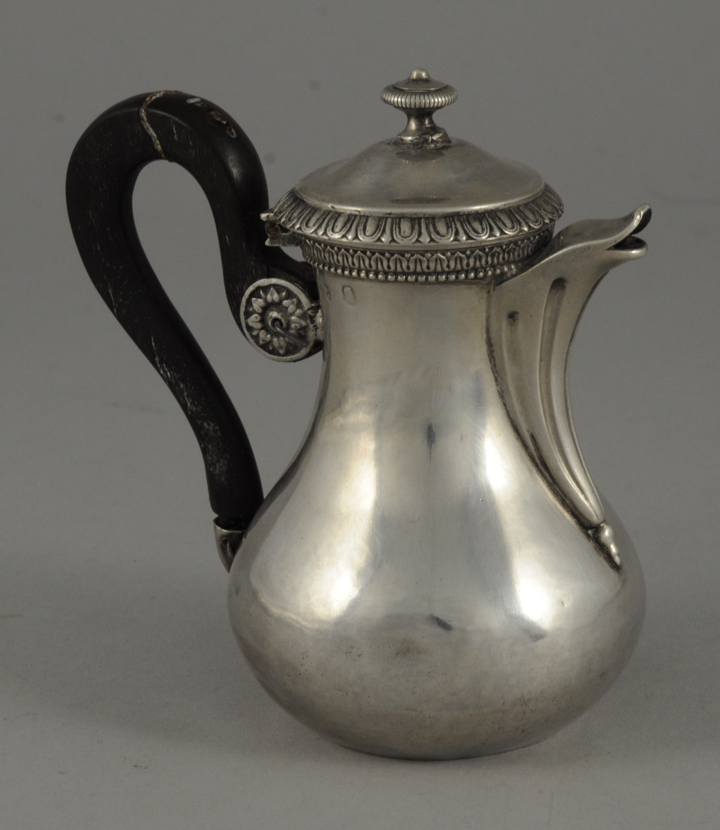 VERSEUSE ÉGOISTE à panse basse en argent. Décor de frises de feuilles lancéolées et fleurons. Le bec orné de cannelures. L'anse en bois.