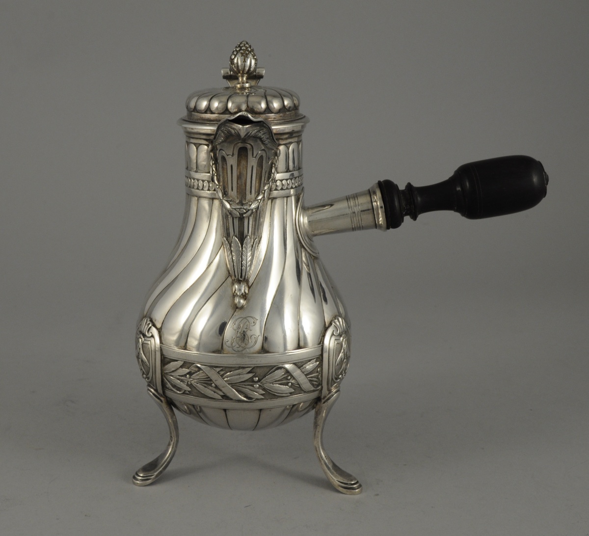 VERSEUSE en argent à côtes godronnées torsadées et couronne de laurier enrubannée, fretel à pomme de pin, sur un piétement tripode à médaillons. Monogrammée sur le corps "BC". Datée sous le corps "5 mars 1887", monogramée "CM"