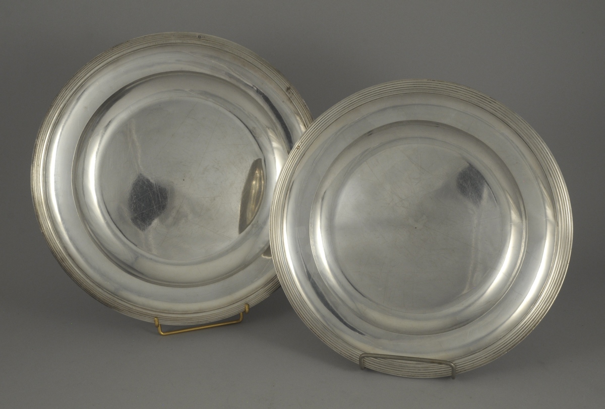 2 PLATS de forme ronde en argent. Bordure à filets. D'un même service.