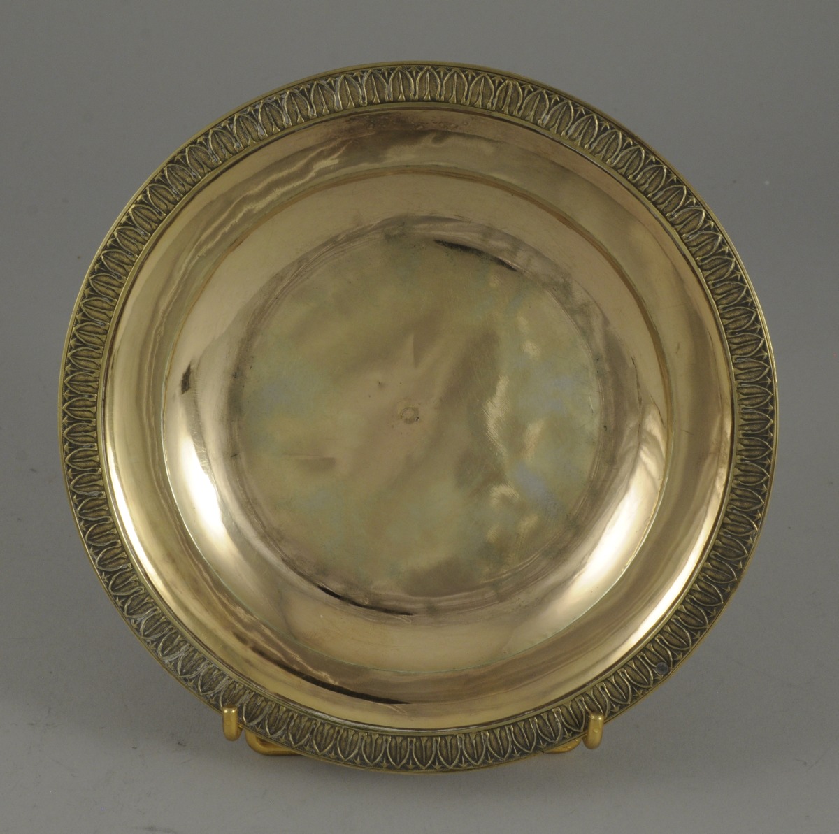 PETIT PLATEAU de forme ronde en vermeil. Le bord de l'aile ciselé d'une frise de feuilles d'eau.