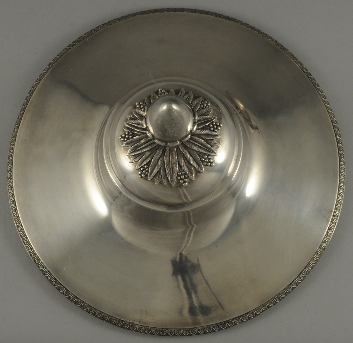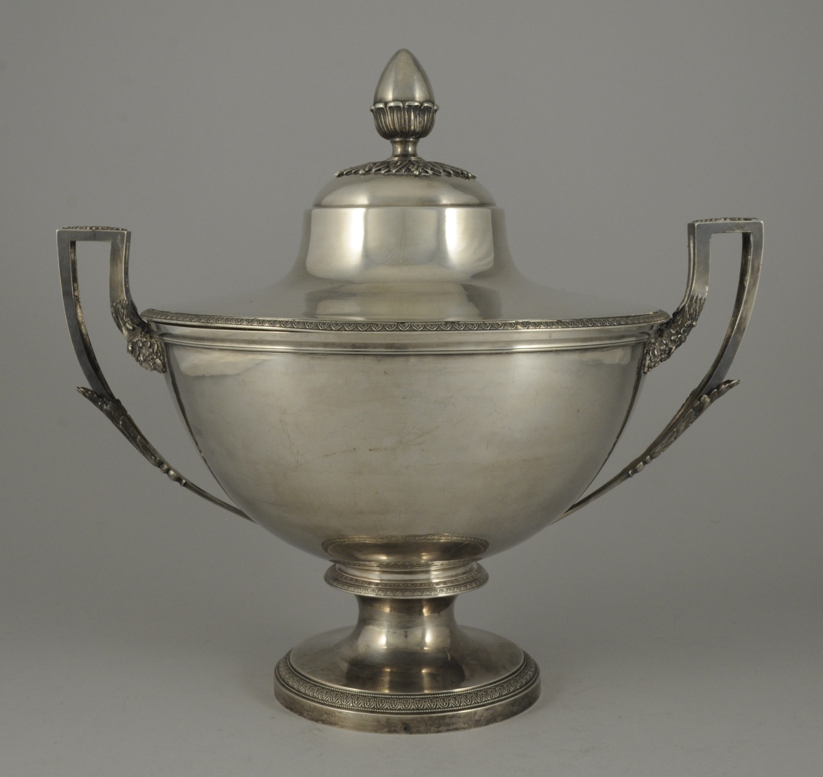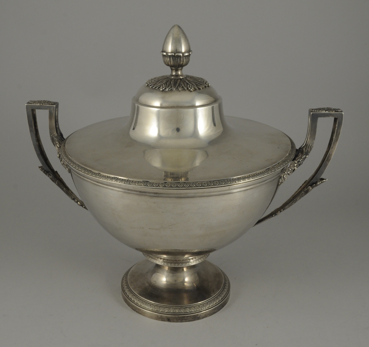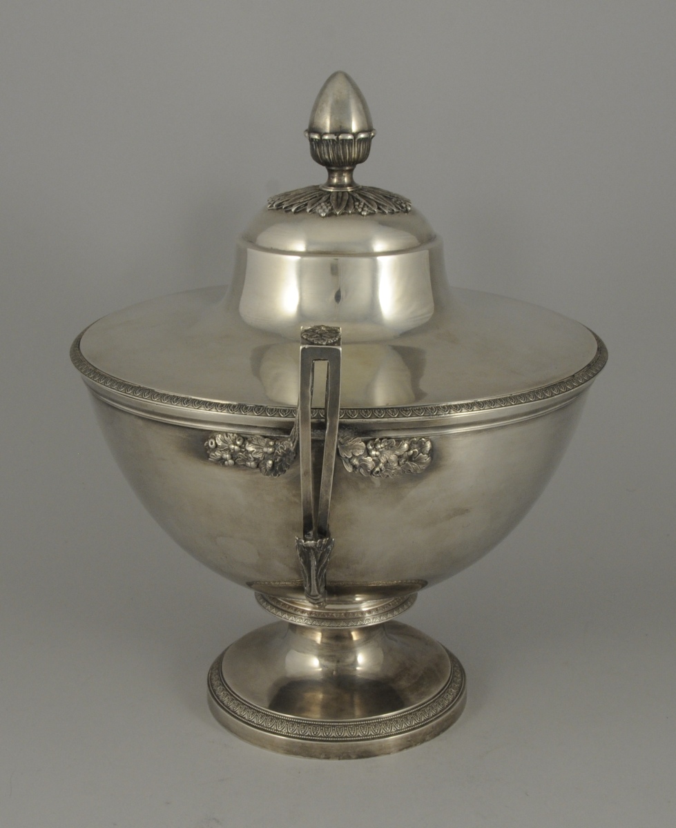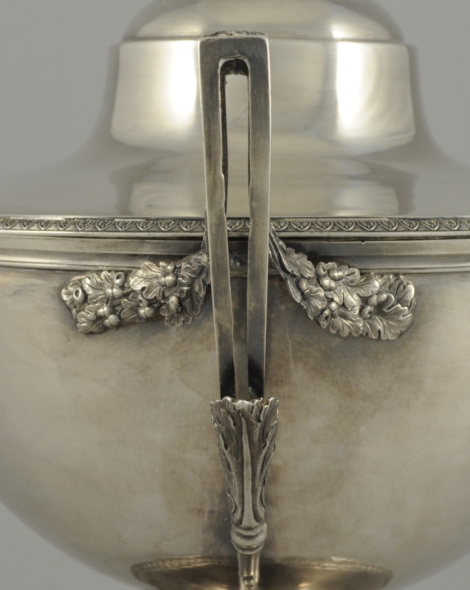 POT À OILLE de forme ronde en argent uni. Il pose sur un piédouche bordé d'une frise de palmettes, en rappel sur le bord du couvercle. Les anses ajourées suivent la forme du corps et présentent un fleuron à l'amortissement. Les attachent figurant des branches de chêne. La prise du couvercle adopte la forme d'un gland sur un lit rayonnant de feuilles et fruits lancéolés.