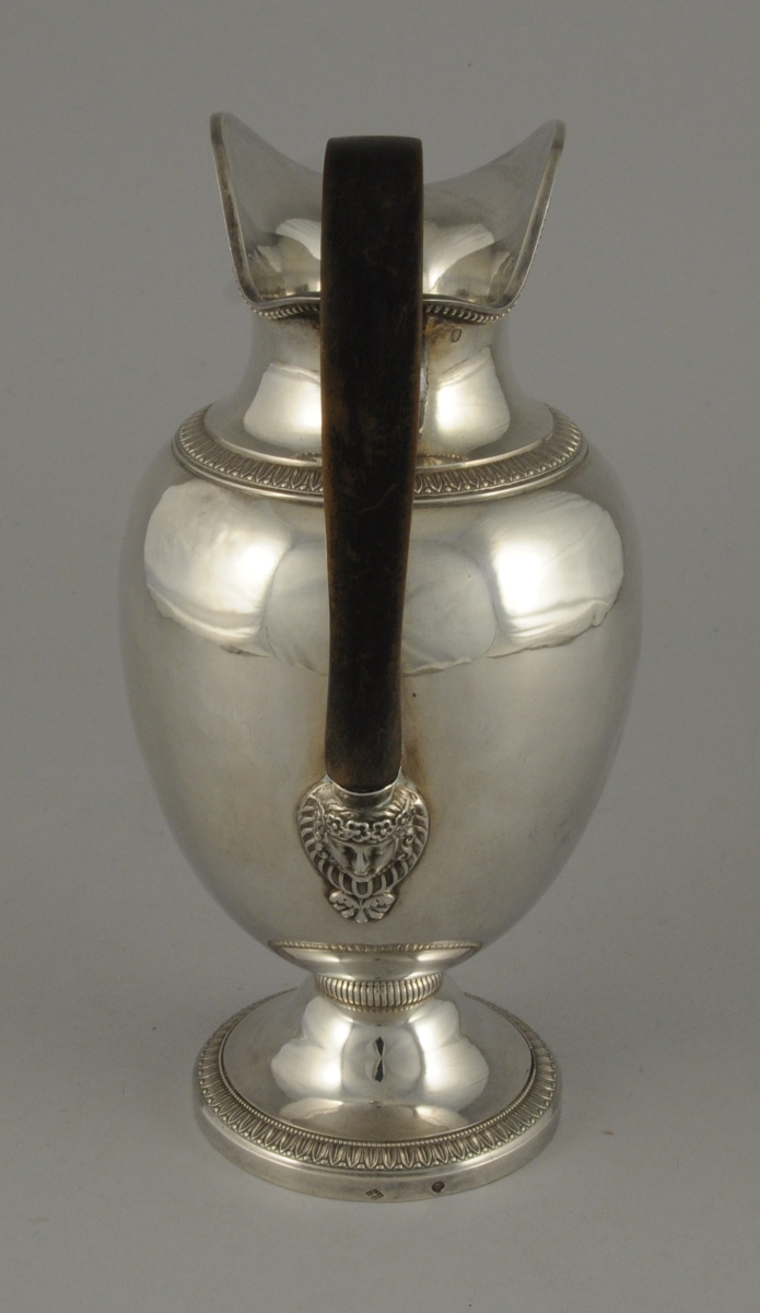 VERSEUSE argent, posant sur un piedouche. Ornementation de frise de feuilles d'eau et rais de perles. L'anse en bois noirci relié au corps par un fleuron et une tête de femme couronnée de fleurs inscrite dans une palmette.