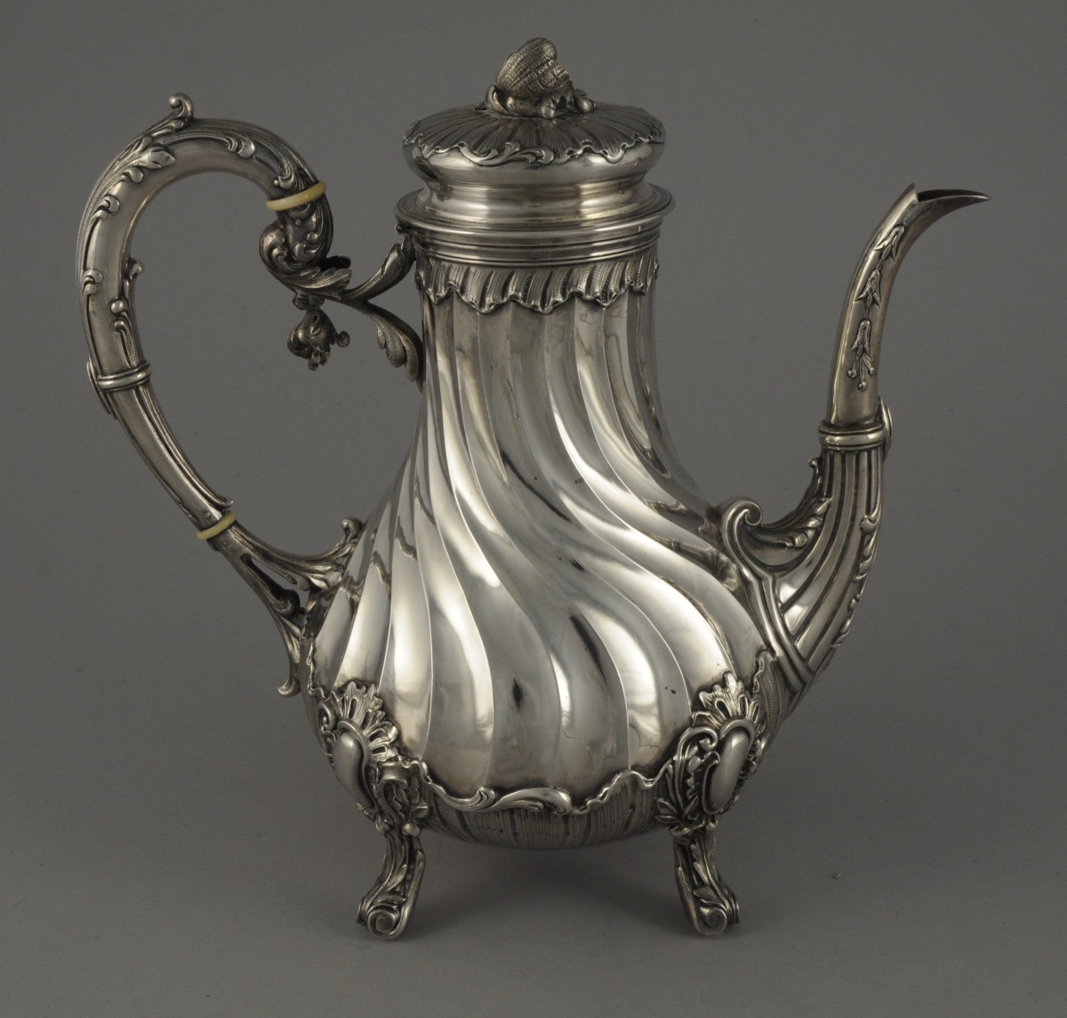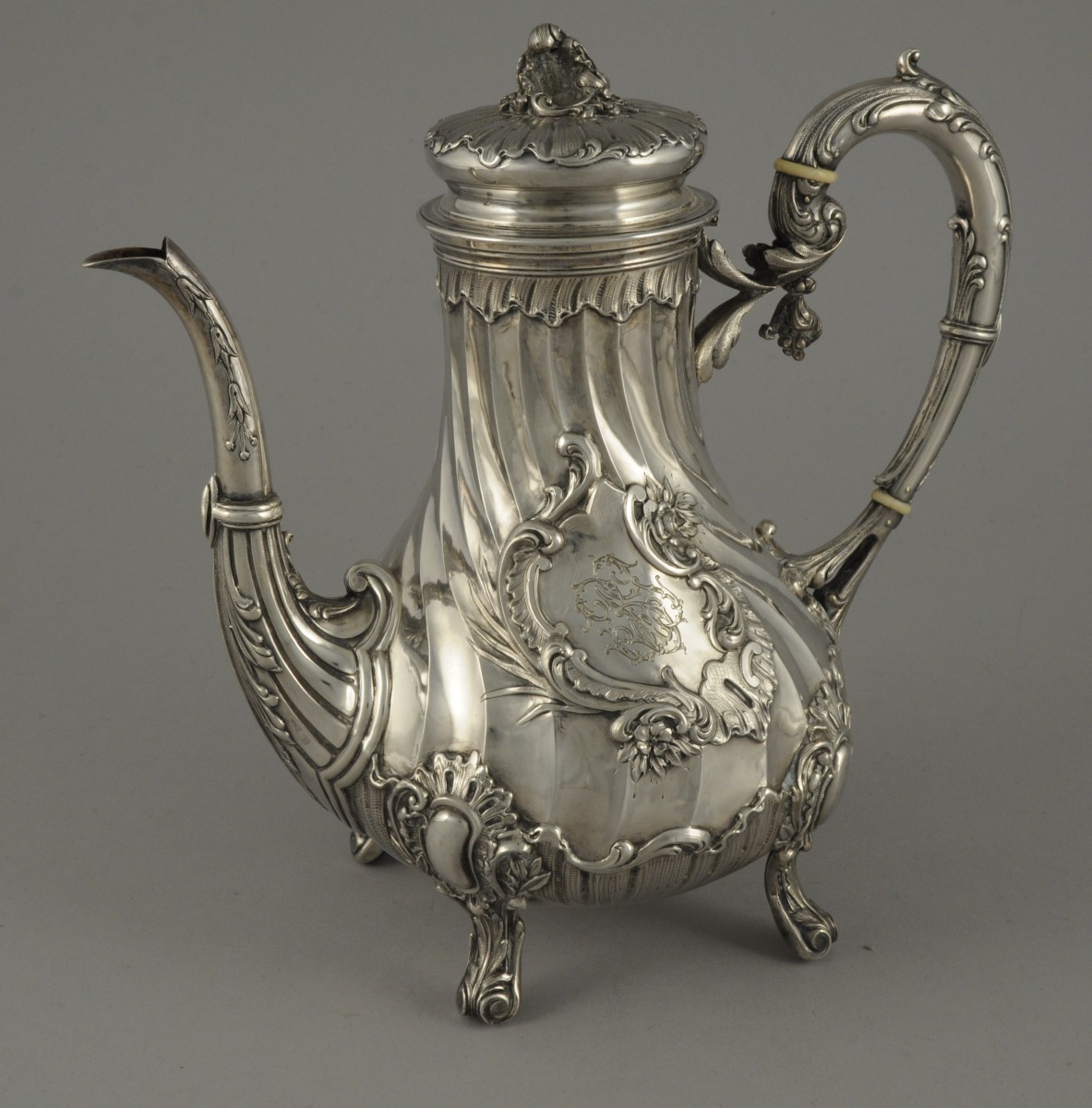 VERSEUSE à panse basse ornée de côtes torses en argent. Riche ornementation de style rocaille telle que feuilles d'acanthe, rinceaux feuillagées et coquilles. Le corps orné en application d'un cartouche monogrammé "BG". Elle pose sur quatre pieds terminés par des volutes. Les attaches adoptent la forme d'un cartouche encadré de feuillages. L'anse baguée d'ivoire. Le fretel en forme de coquille stylisée.