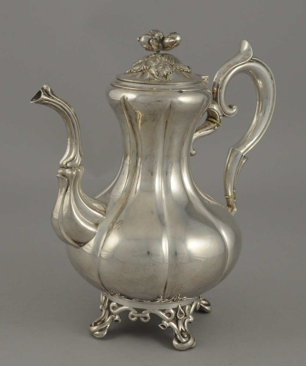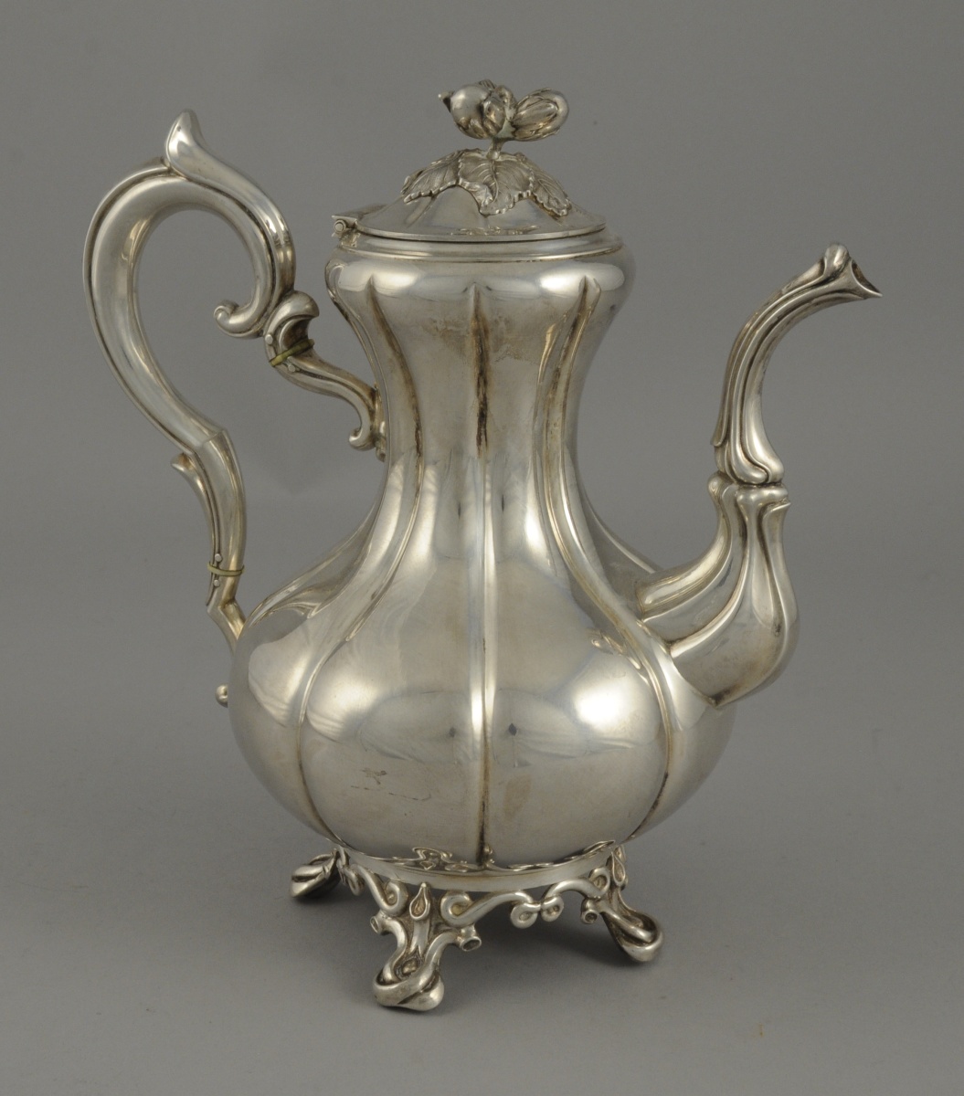 VERSEUSE PANSUE A CÔTES en argent reposant sur quatre pieds à enroulement, anse nervurés, bec nervurés, deux petits anneaux d'ivoires, fretel en noisettes anse