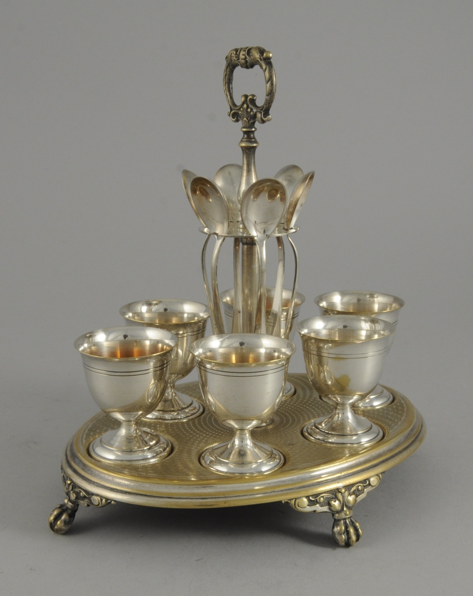 Ils sont présentés avec 6 CUILLÈRES À OEUF en métal argenté sur un PRÉSENTOIR en métal argenté. De forme ovale, il repose sur quatre pieds griffes. La prise formée de deux dauphins affrontés. Le plateau orné de guillochis. XXème.