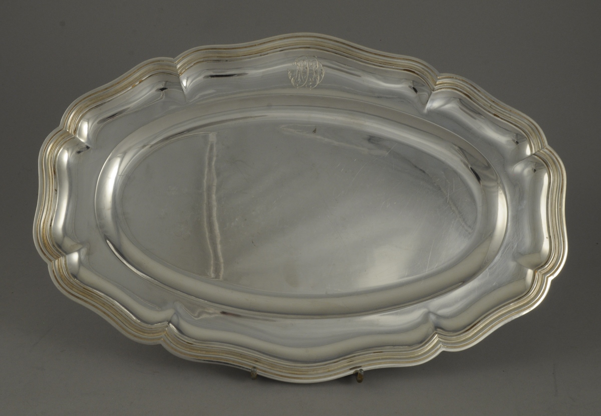 PLAT OVALE en métal argenté, modèle à batte contour. Monogramme "MDB" gravé sur l'aile.