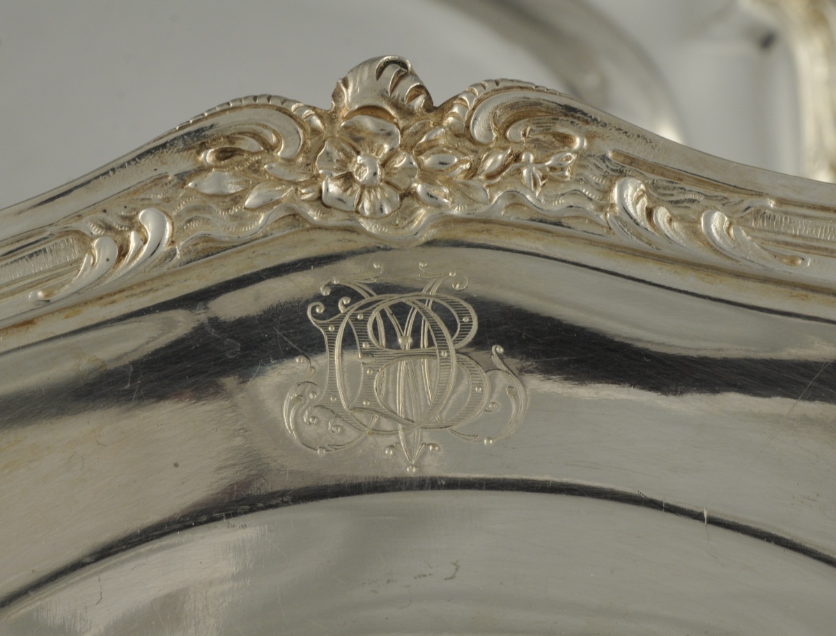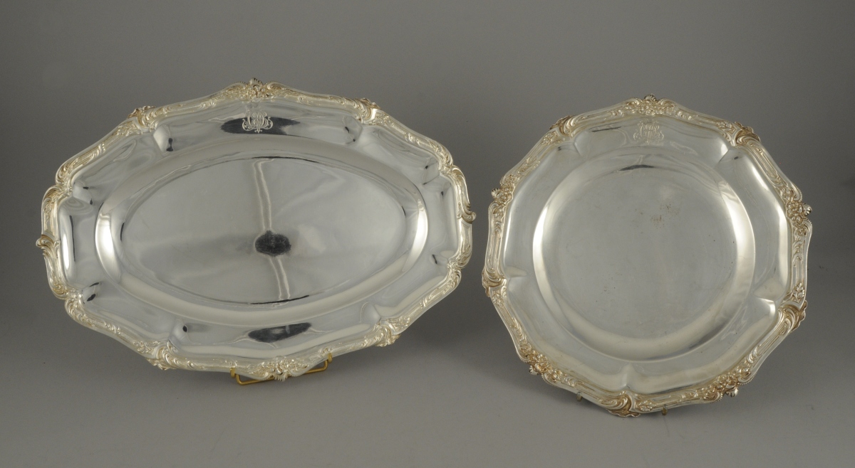 2 PLATS en métal argenté, modèle à bords chantournés ciselé de rinceaux feuillagés et de fleurs. L'un ovale, l'autre rond. Monogramme "MDB" gravé sur l'aile.