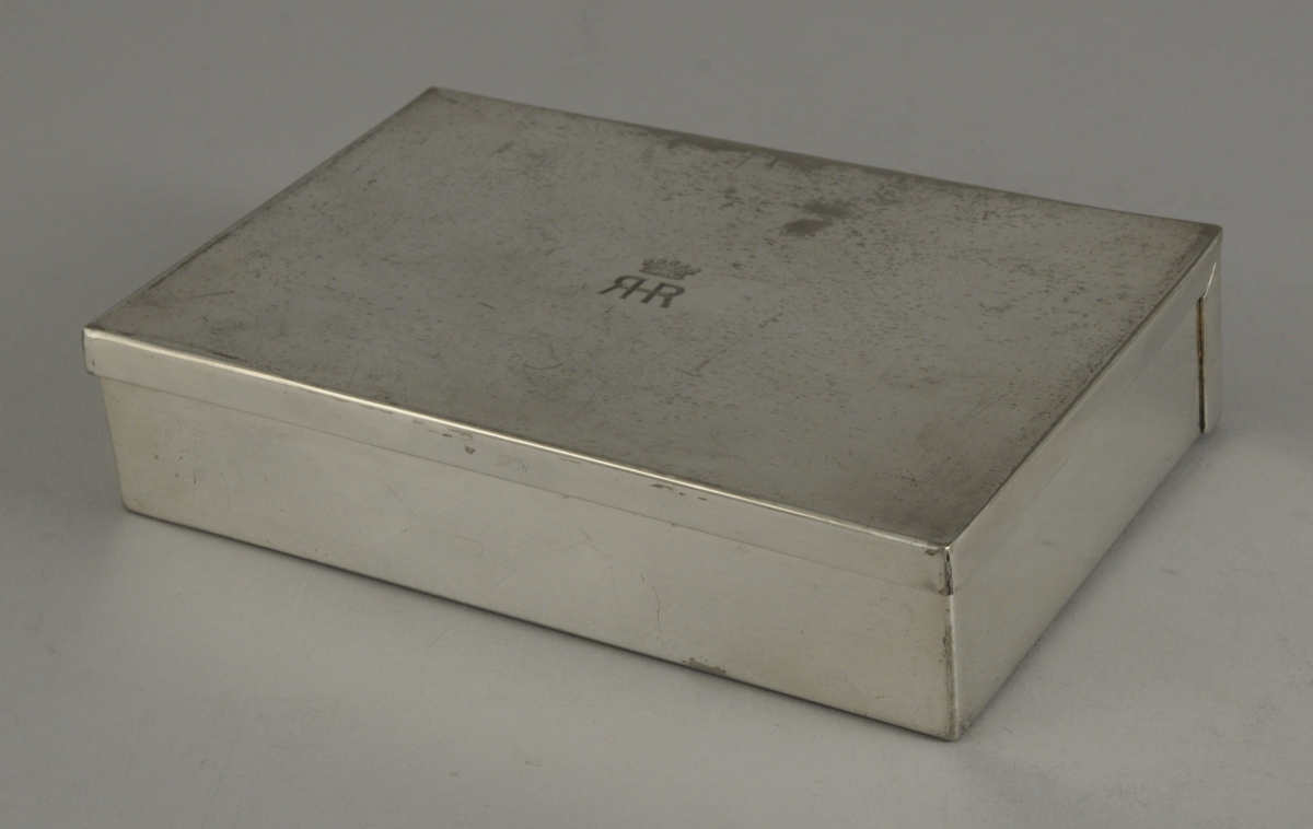 BOITE À CIGARES DU BARON ROBERT DE ROTHSCHILD, de forme rectangulaire en métal argenté, gravée du chiffre "RR" pour sous un tortil de baron, poignée articulée.