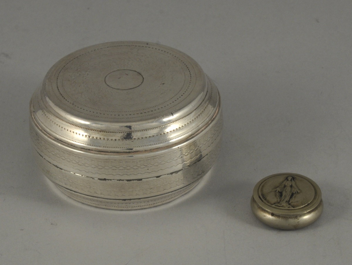 JOINT: PETITE BOÎTE À PILLULES en maillechort. Le couvercle à décor repoussé de la Vierge de la Médaille Miraculeuse. Diam. 2,9, Haut. 1 cm;