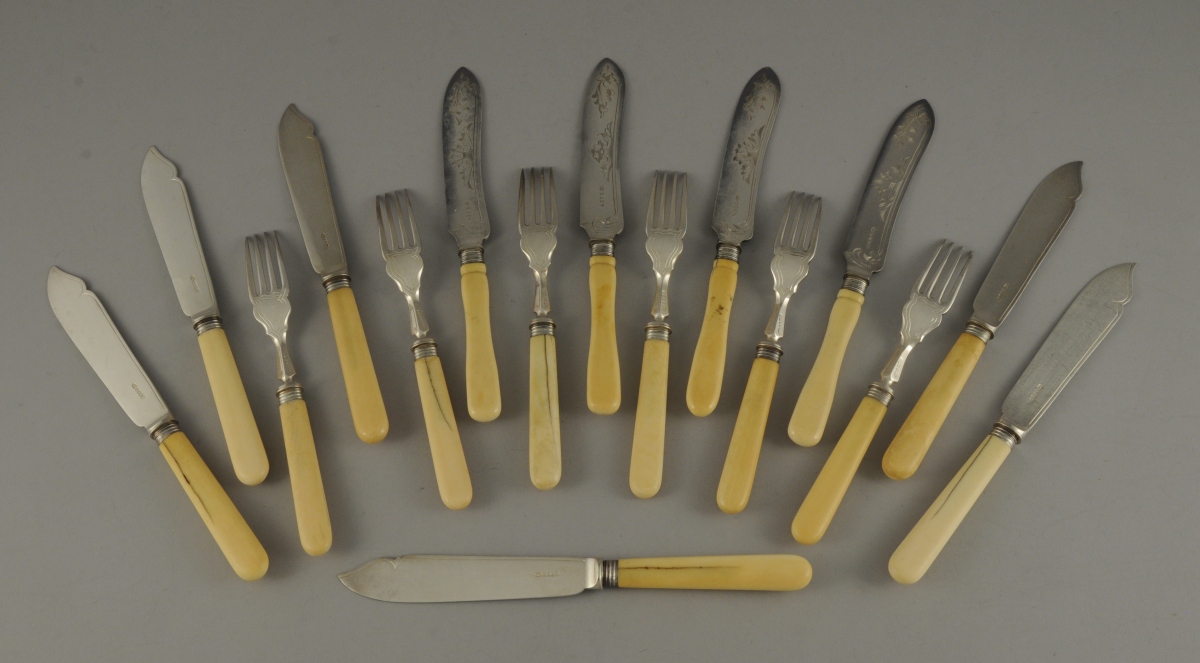 Suite de 6 FOURCHETTES ET 6 COUTEAUX DE TABLE en métal argenté gravés de filets. Le manche en ivoire. Maître-Orfèvre: William Hutton & Sons, actif à Sheffield en Angleterre. Poinçon "BP" pour "Brittania Plated". Fin XIXème, début XXème.