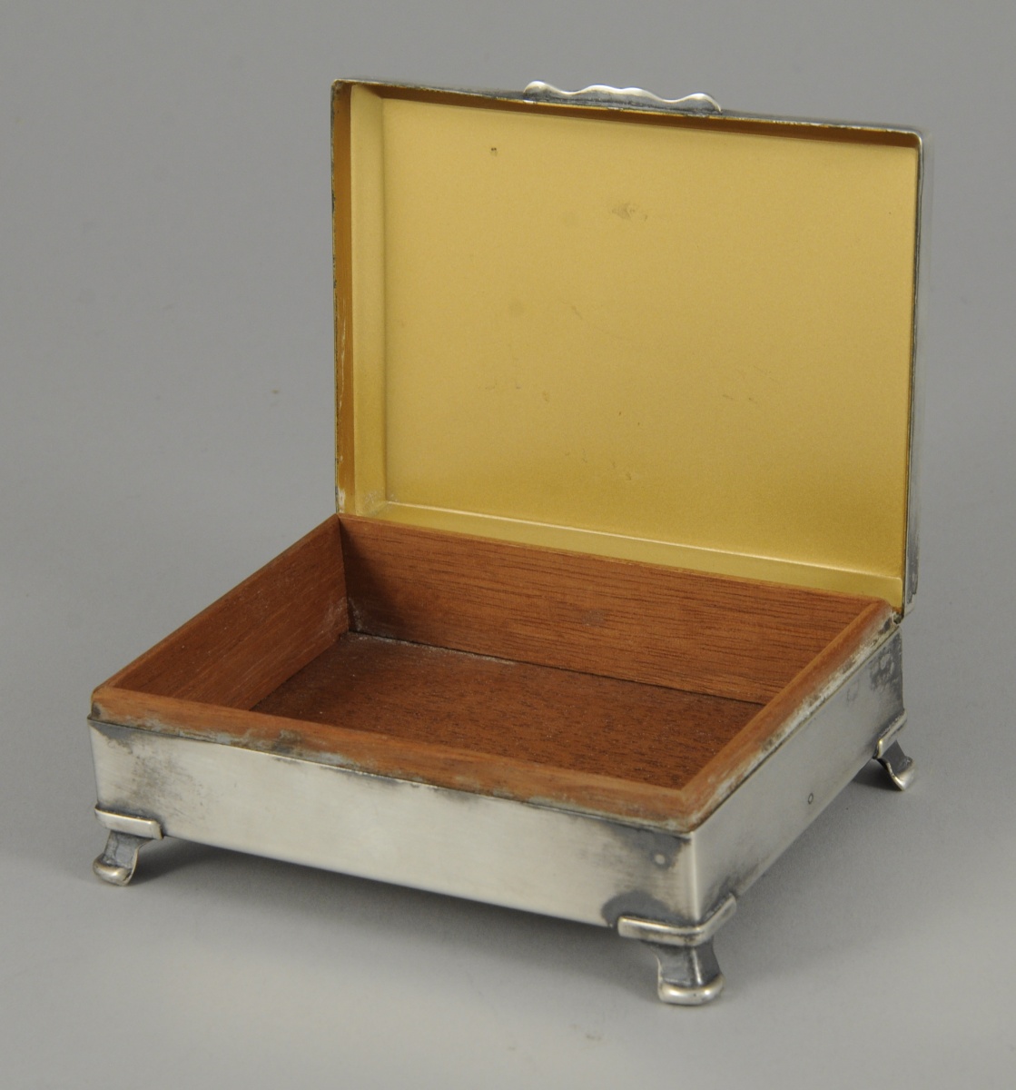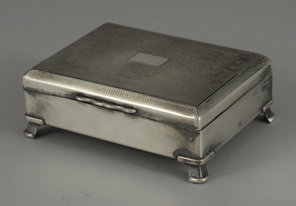 Petite BOÎTE À CIGARES de forme rectangulaire en métal argenté posant sur quatre petits pieds. Le couvercle à pans coupés à décor guilloché. L'intérieur doublé de cèdre en partie inférieure. Marquée "ARISTOCRAT / H. E.P.N.S. B. / MADE IN ENGLAND".