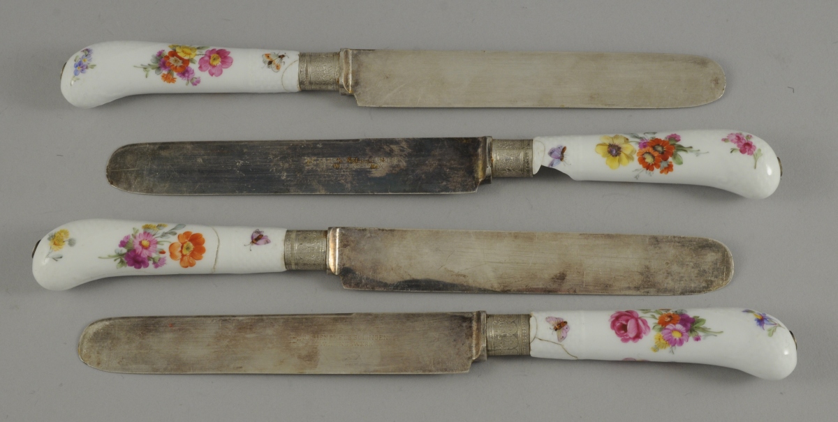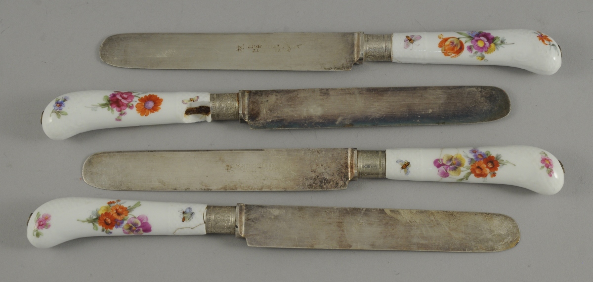 SAXE. 4 COUTEAUX à manche crosse en porcelaine de vieux Saxe peinte de fleurs et de papillons. Lame en acier marquée "J.A. HENCKELS SOLINGEN ZWILLINGSWERK". Bague en métal.