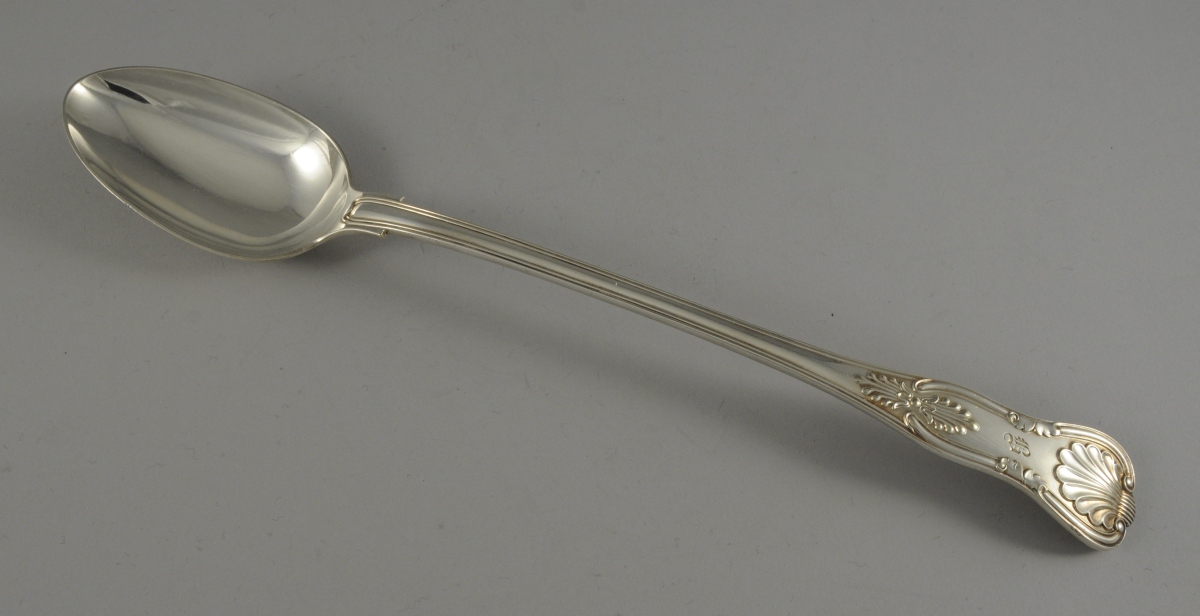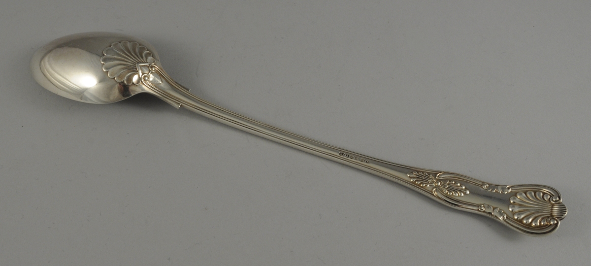 CUILLÈRE À RAGOÛT en métal argenté. Motifs de palmettes et agrafes. Monogramme "B".