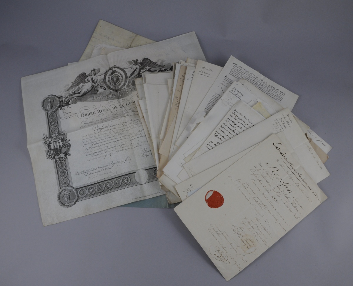 CORRESPONDANCE FAMILIALE, notamment à sa femme ou sa mère ; minutes de lettres... Certificats et brevets (commandeur de la Légion d'honneur). Lettres et pièces par Prosper de BARANTE, BARBE-MARBOIS, maréchal de BELLUNE (2), duc de BERRY (certificat), Alexandre BERTHIER prince de Wagram, maréchal comte de BOURMONT (2), BOYER DE PEYRELEAU (2), général comte de CAUMONT, CLARKE duc de FELTRE (2), comte de COËTLOSQUET (3), maréchal GERARD (3), GOUVION SAINT-CYR (4), duc de GUICHE, marquis de LA GRANGE (certificat), duc de LA TREMOILLE, maréchal de LAURISTON (7), baron LEFEBVRE DESVAUX, comte de LINOIS, maréchal MACDONALD, comte MOLE, comte de MONTESQUIOU, maréchal OUDINOT duc de Reggio, général RICARD, duc de RICHELIEU, général SAINT-CYR NUGUES, maréchal SOULT duc de Dalmatie (2), etc.