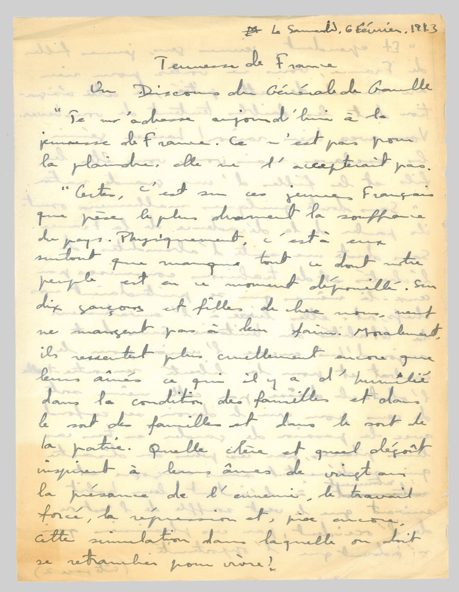 Célèbre discours du Général de Gaulle, prononcé à la BBC le 25 février 1943. Ce manuscrit de Jean Oberlé est daté