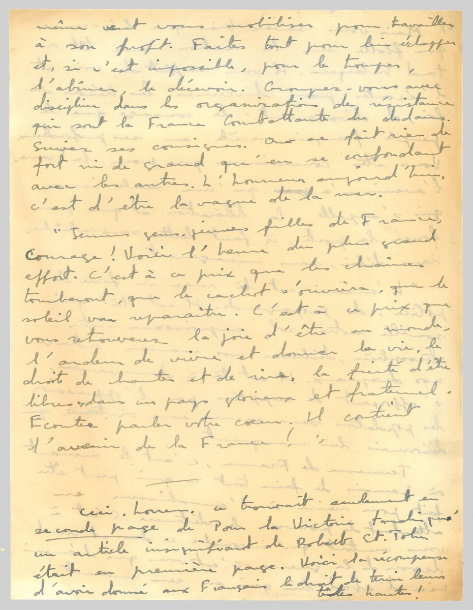 Jean Oberlé ajoute à la fin du manuscrit: "Ceci, Lorren (?) se trouvait seulement en deuxième page de Pour la Victoire, tandis qu'un article insignifiant de Robert Saint John était en première page. Voici la récompense d'avoir donné aux Français le droit de tenir leurs têtes hautes".