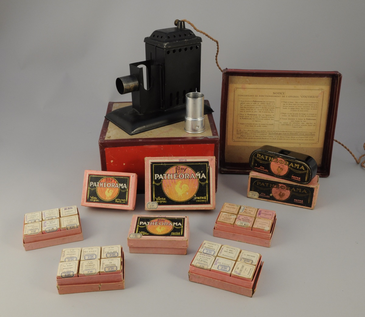 LANTERNE de PROJECTION "COCORICO" de PATHÉ en tôle laquée noire avec VISIONNEUSE "PATHÉORAMA". Avec sa lampe électrique. Lanterne dans sa boîte d'origine avec sa notice. Visionneuse dans sa boîte d'origine portant une étiquette de prix "DAVEAU Frères / SAUMUR".